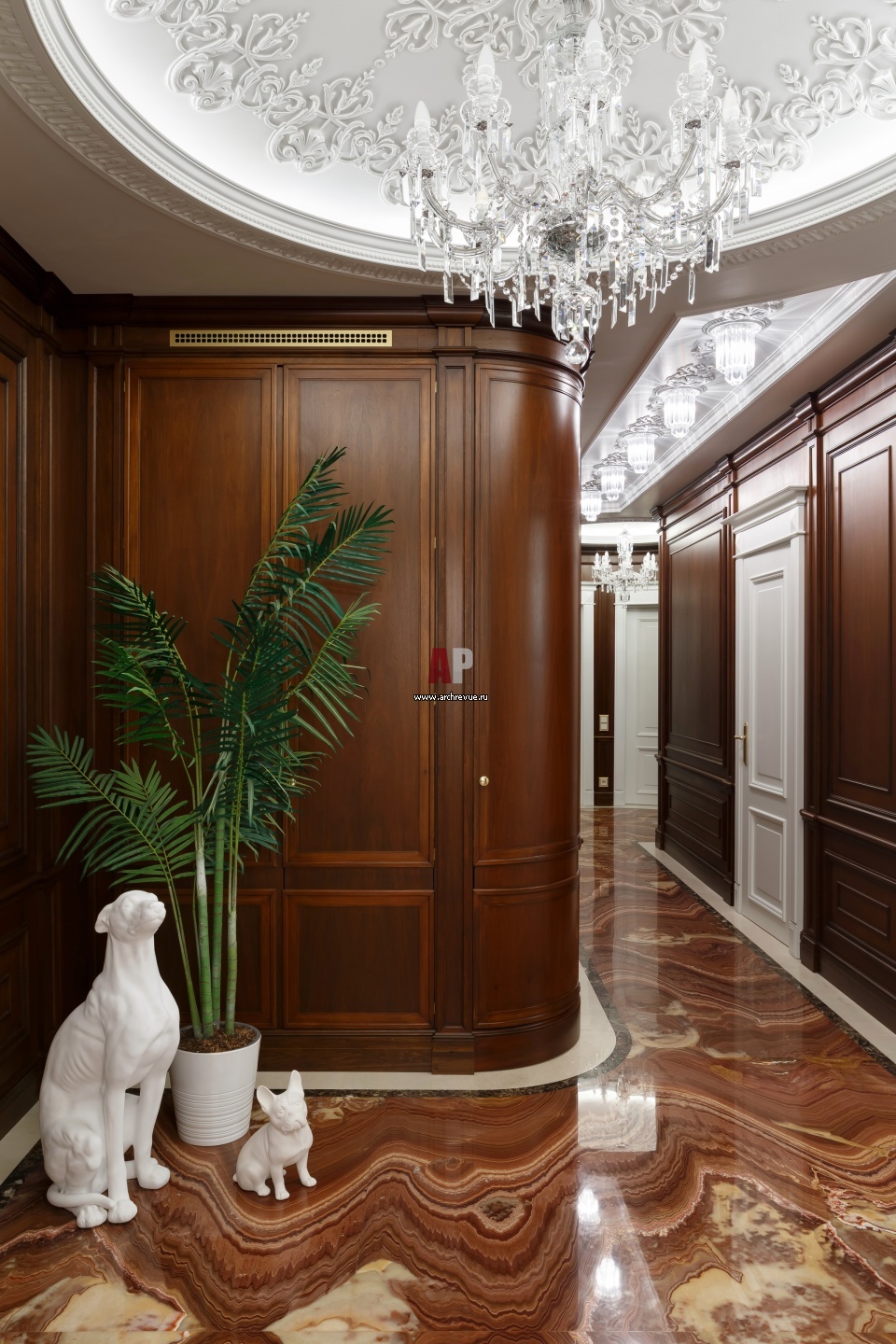 Трехкомнатная квартира с элементами английского стиля и статусным декором. Интерьер холла с потолочным куполом и напольным панно из оникса.