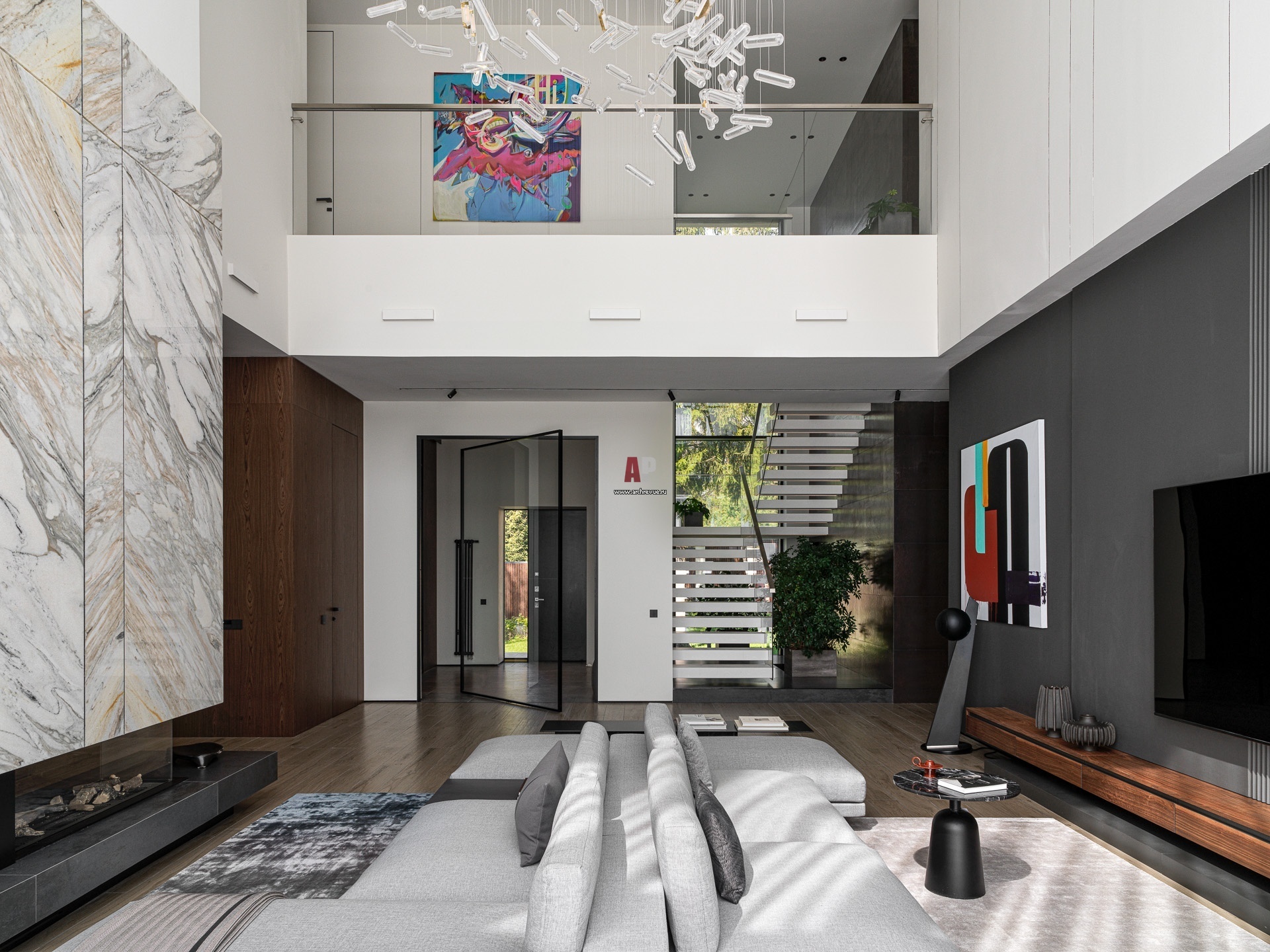 Монохромный интерьер гостиной оживляют яркие живописные полотна современных художников.