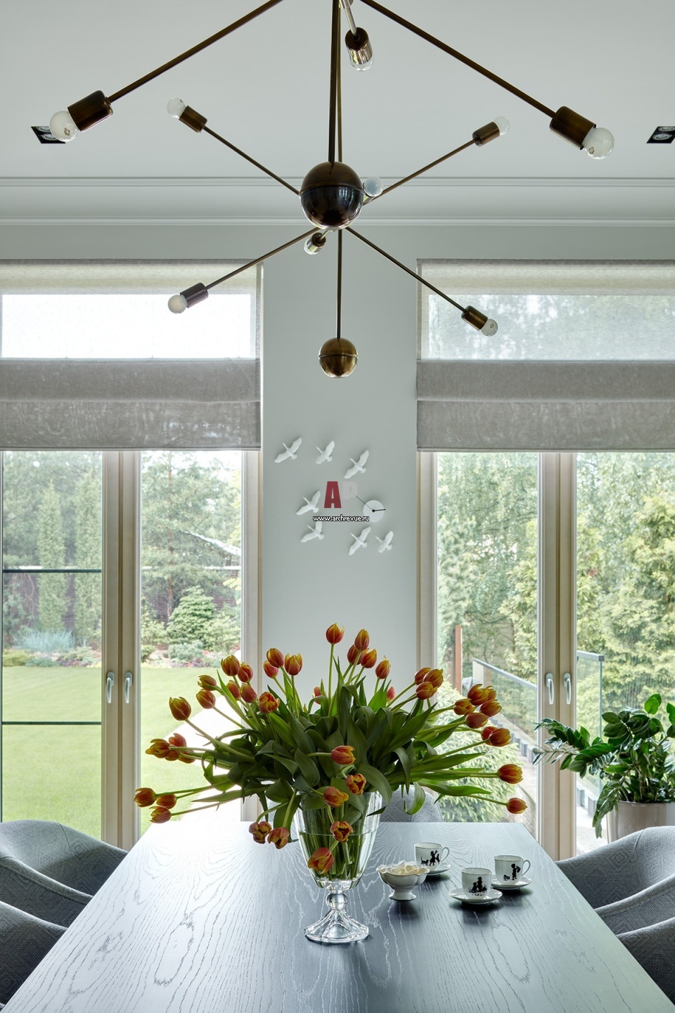 Благодаря большому количеству панорамных окон весь первый этаж пронизан светом.