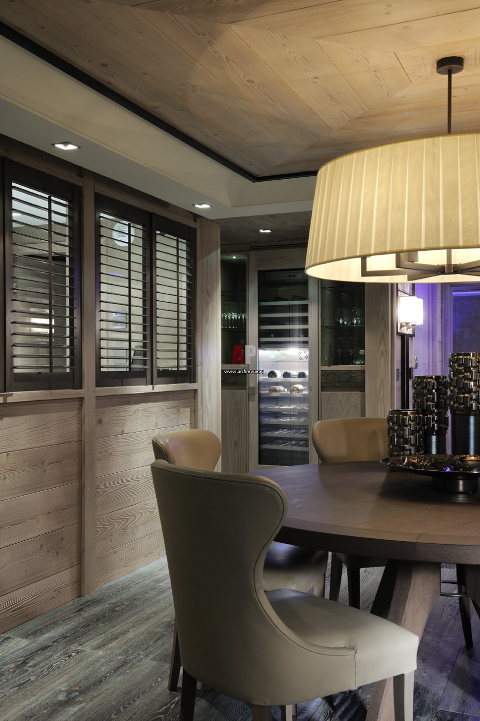 Интерьер зоны столовой в личных апартаментах с винотекой.
