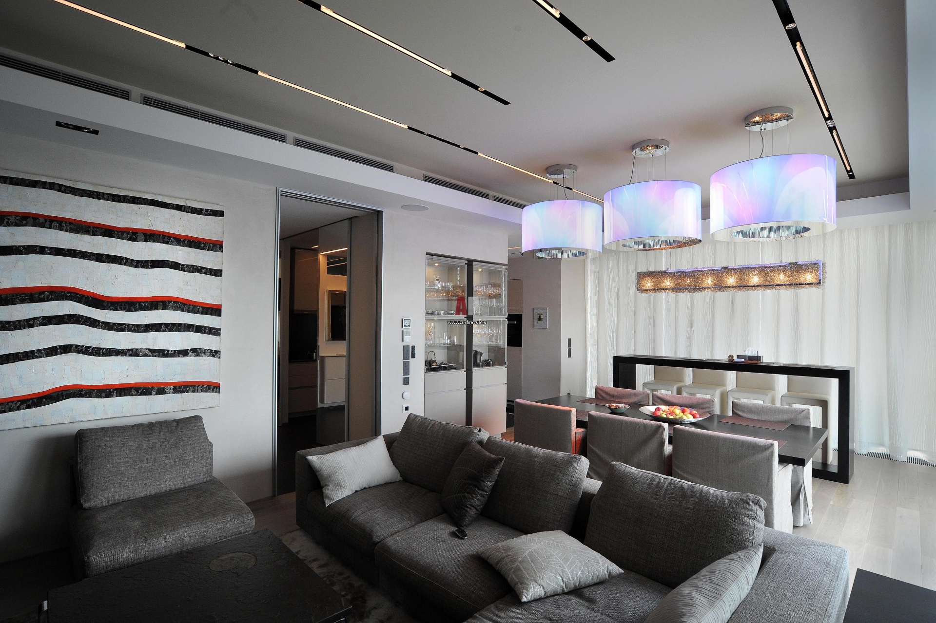 Интерьер гостиной выдержан в серо-жемчужных тонах. Картина «Движение», из коллекции заказчиков.