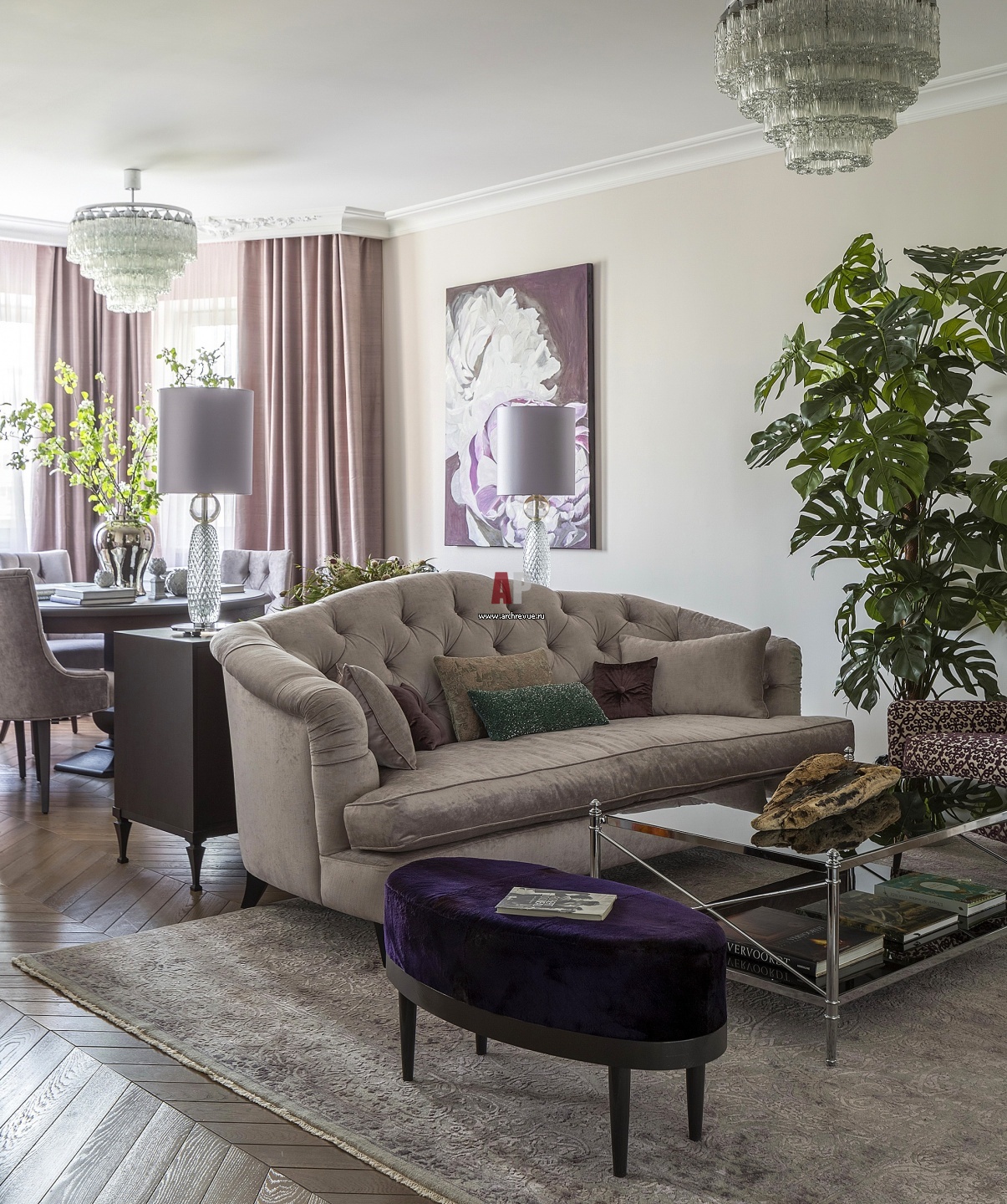 Объединенная гостиная-столовая площадью 27 кв. м. Диван, Softhouse. Люстры в стиле модернизм, винтаж, Италия.