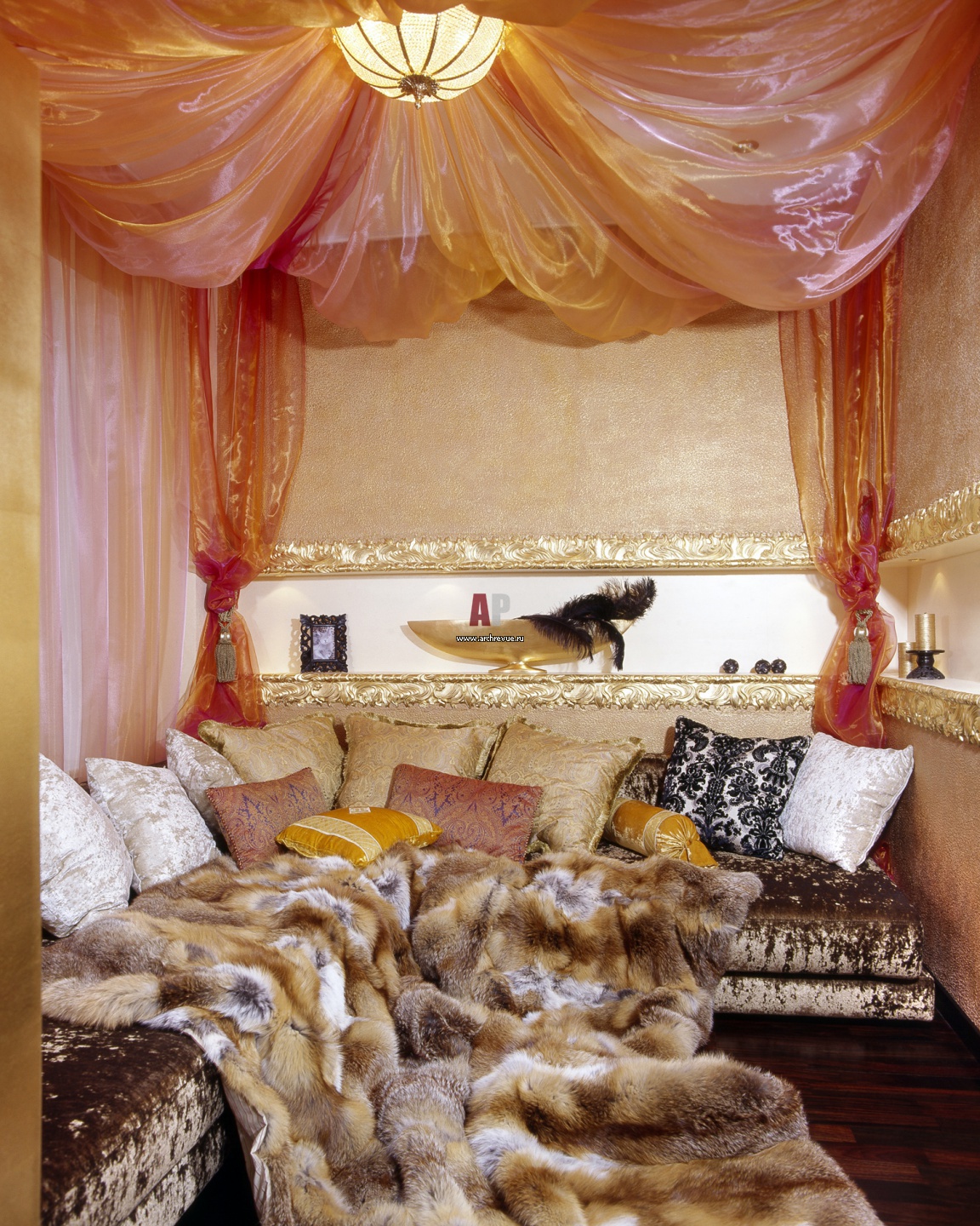 Восточная кальянная похожа на шатер. Драпировки из органзы венчает светильник, декорированный мелкими хрустальными бусинами. На стенах – золотые декоративные штукатурки на базе Sikkens.