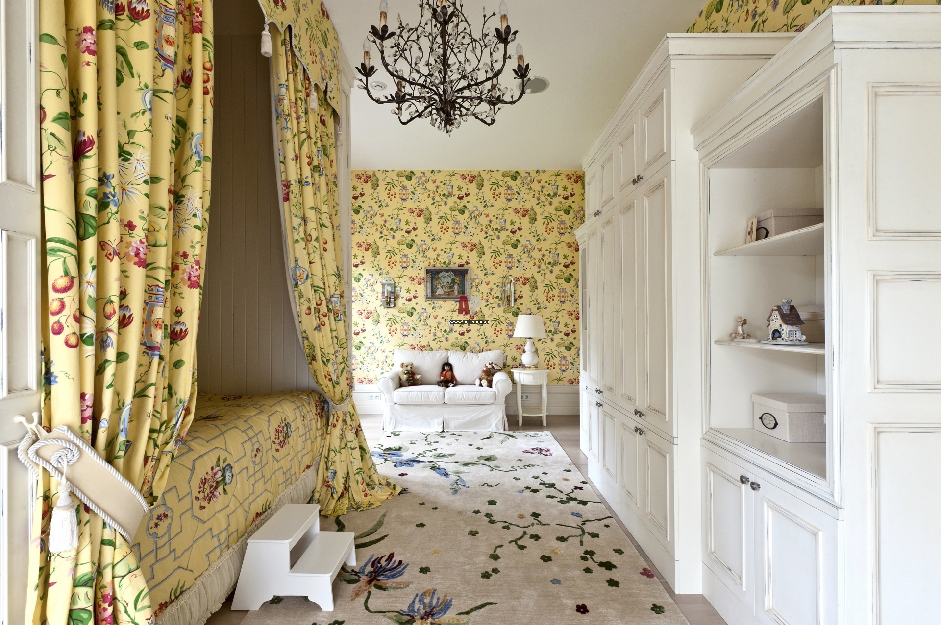 Спальня девочки оформлена обоями и текстилем яркого желтого цвета. Белая встроенная мебель рифмуется с текстилем Thibaut.
