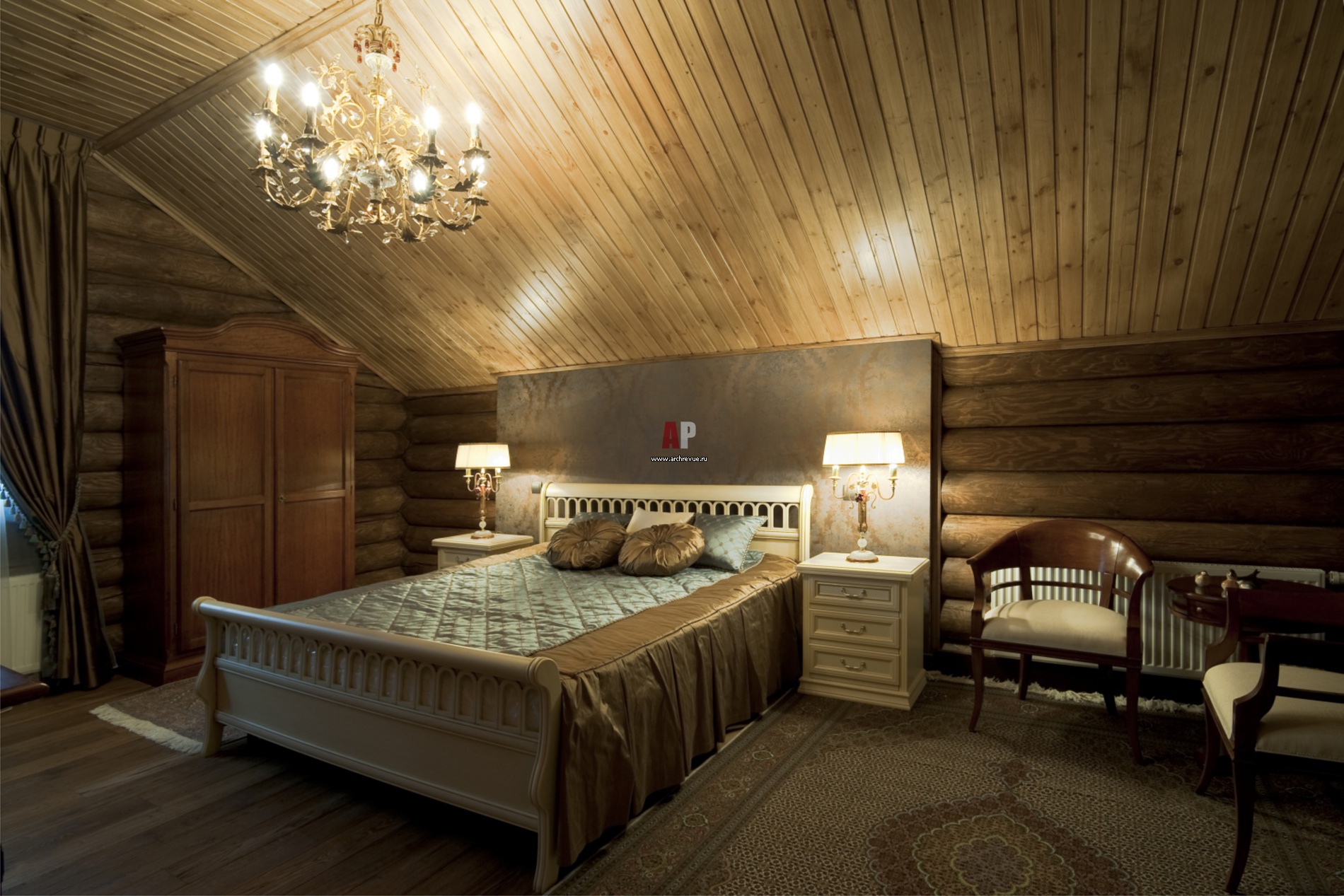 Гостевая спальня в деревянном доме решена в классическом стиле. Кровать и тумба ALF. Кресло и журнальный столик Bruno Piombini. Шкаф Tonin Casa.