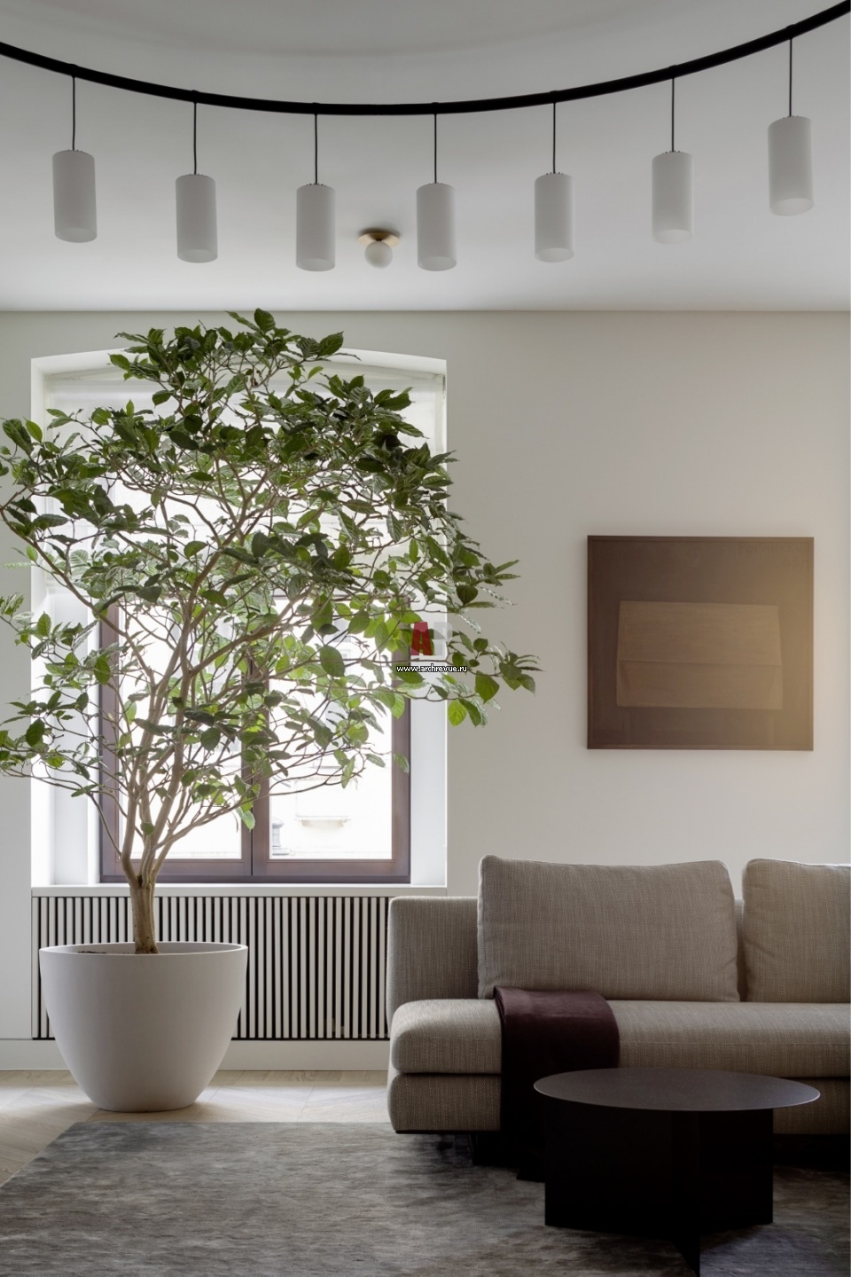 Гостиная. Два парных масштабных светильника в гостиной на уровне потолка разделяют три разные зоны гостиной.