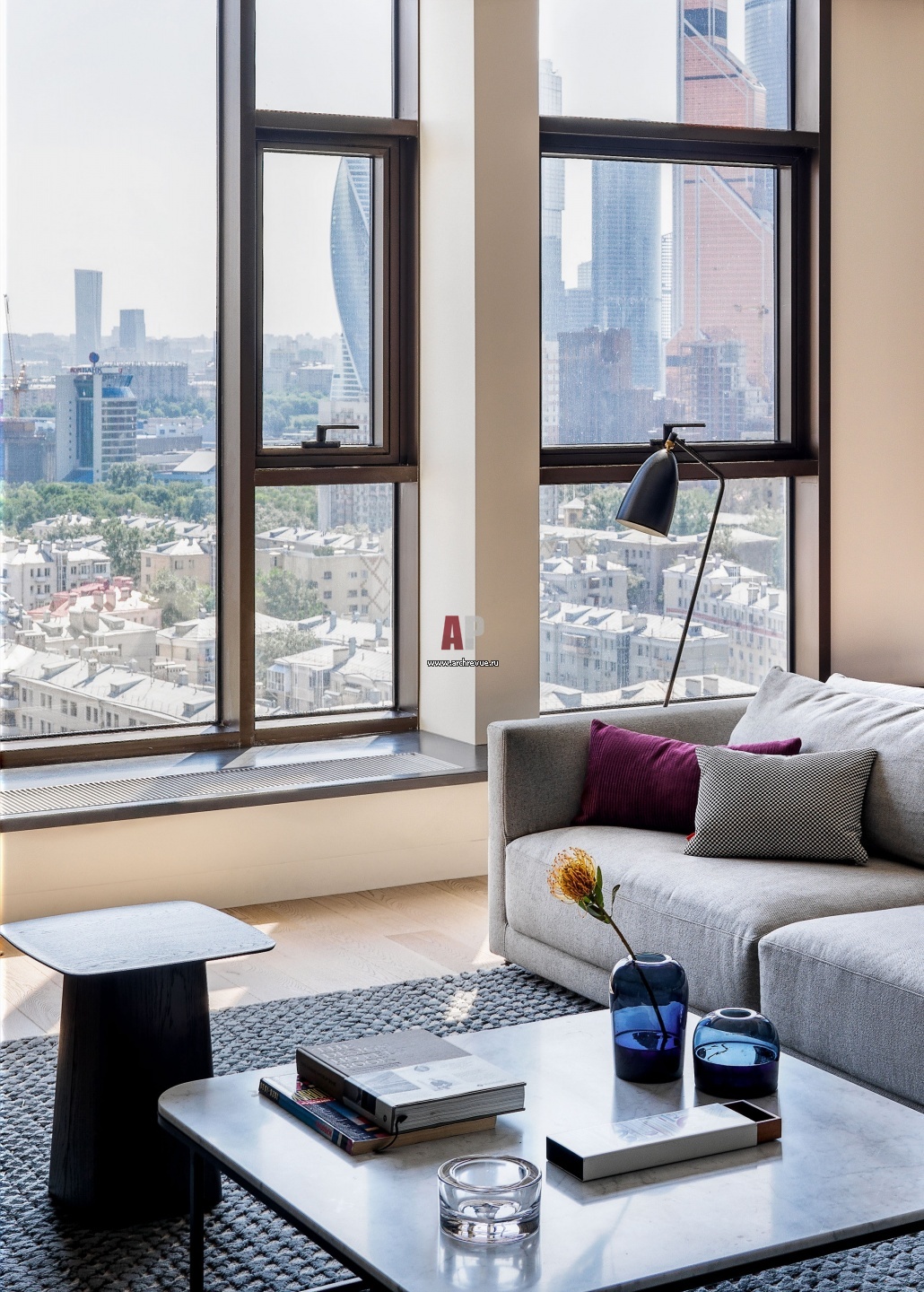 Четырехкомнатная квартира, вдохновленная высотками Москва-Сити. Интерьер панорамной гостиной.