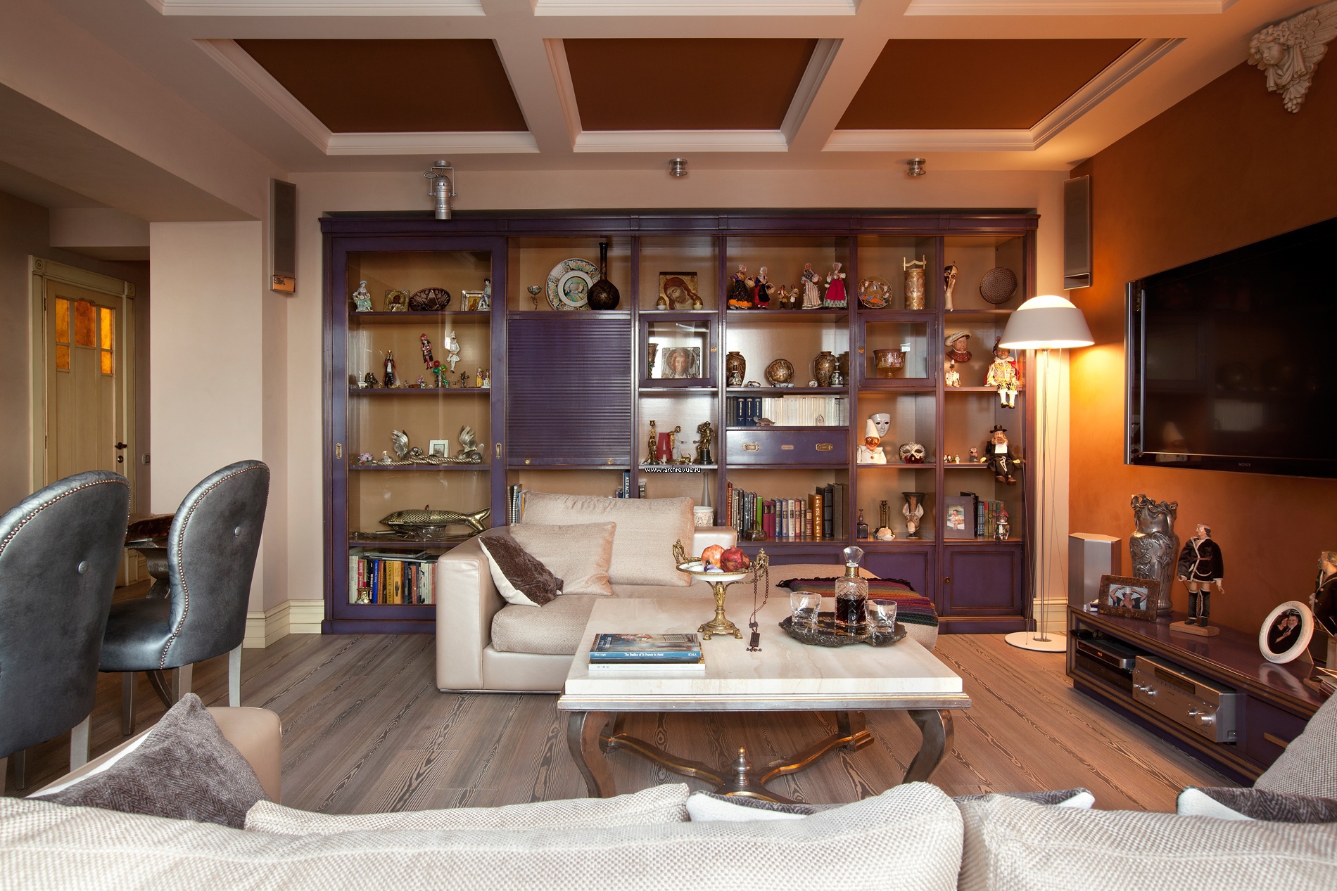 Шкаф в гостиной создан по эскизам авторов проекта мастерами итальянской фабрики Bizzotto специально для размещения данной коллекции предметов искусства. Его фасады решены в благородном фиолетово-лавандовом цвете.