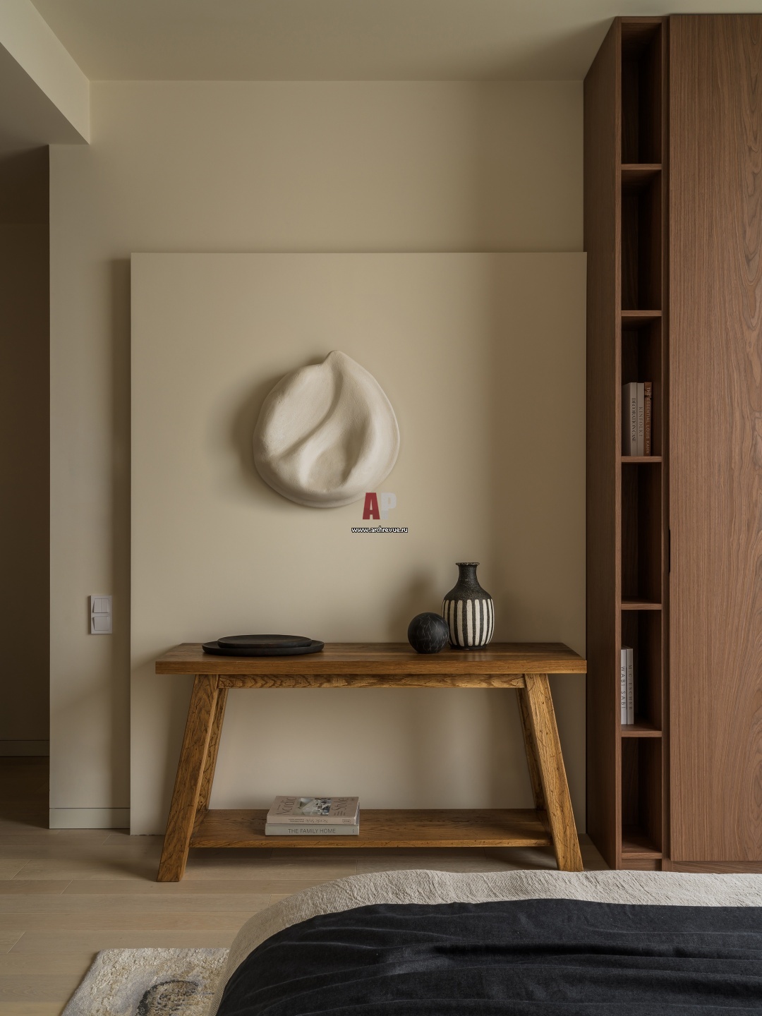 Современная квартира с эстетикой ваби-саби. Интерьер спальни. Консоль выполнена в рустикальном стиле.
