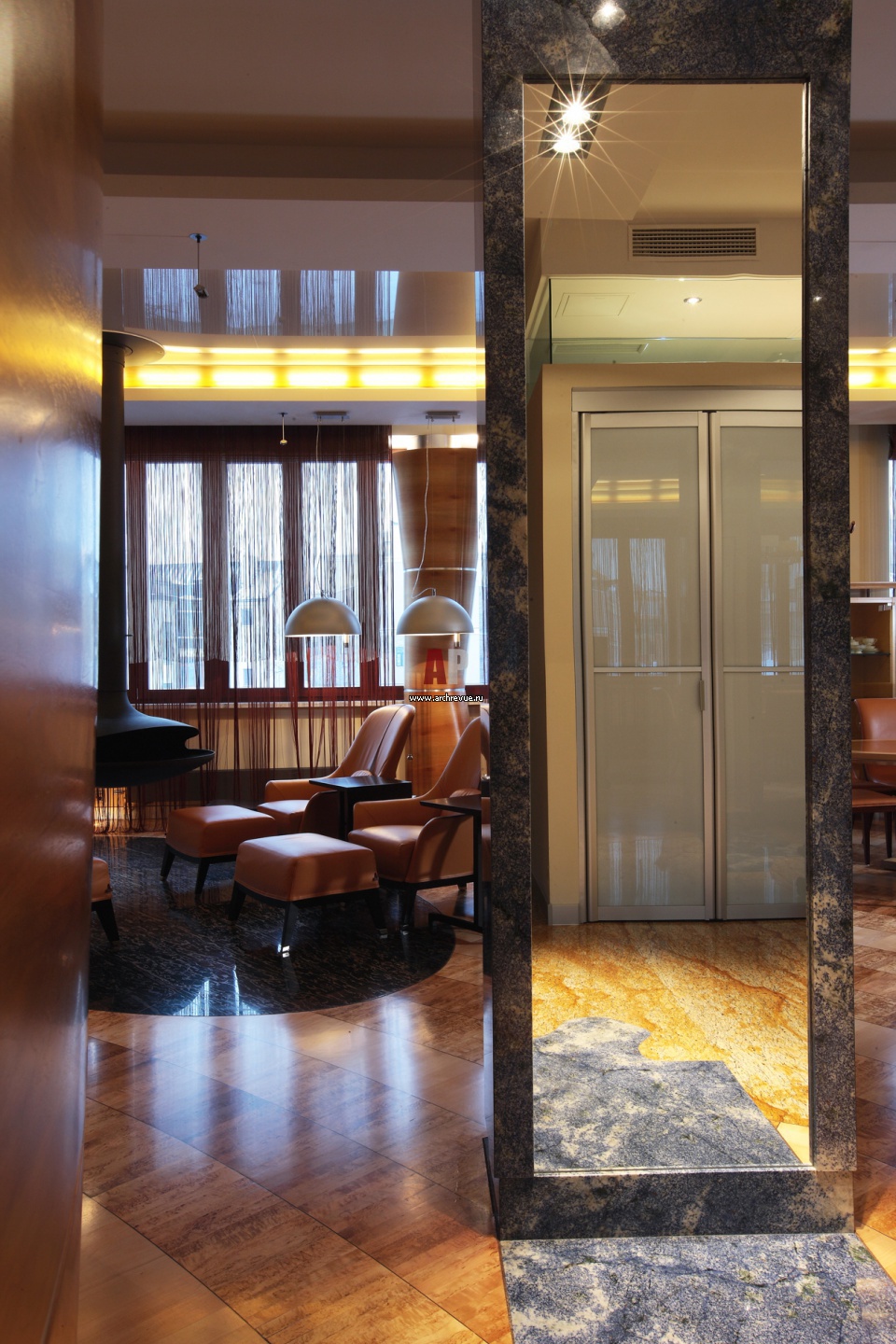 Вид на гостиную со стороны прихожей через декоративный пилон. Материалы в природной цветовой гамме.