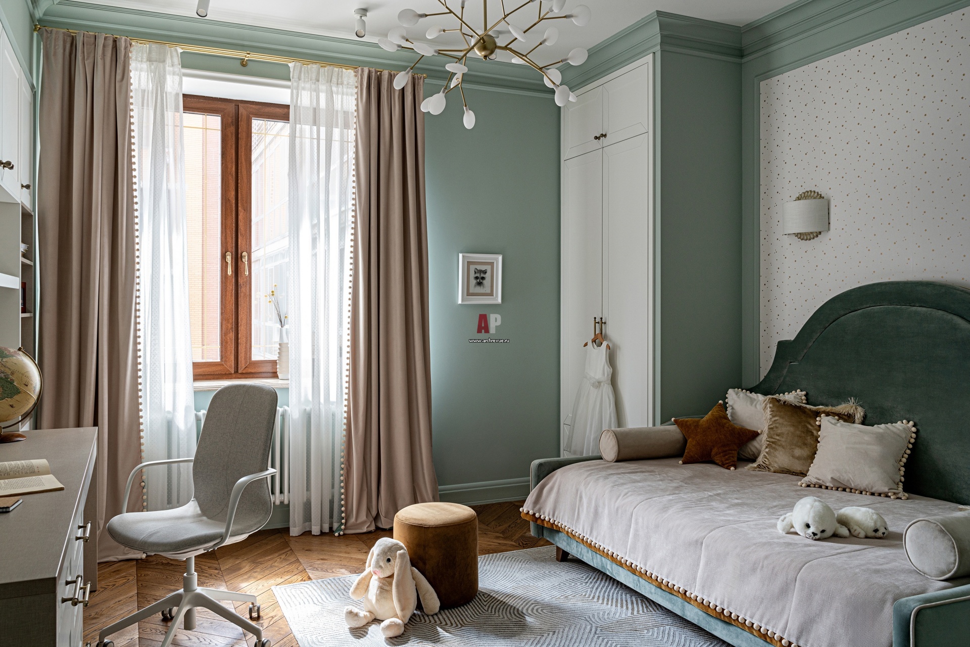 Комната дочери в мятных оттенках – это отдельный мир для маленькой принцессы. Нежные, слегка уловимые золотистые звездочки, домики, помпоны намекают на юный возраст хозяйки комнаты.