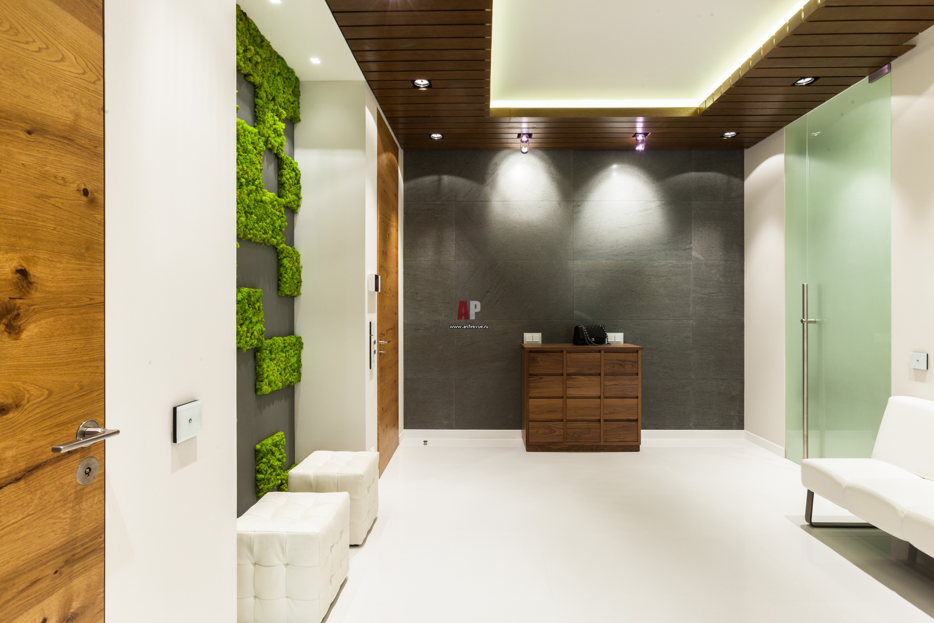 Интерьер входной группы. Одна стена облицована керамогранитом с фактурой сланца, другая выложена эко-плиткой. Белые пуфы, Porada.