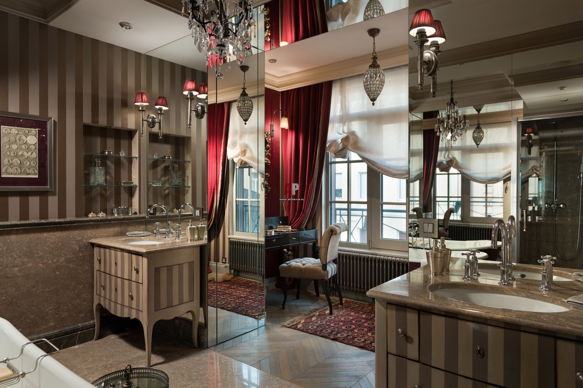 Интерьер классической ванной визуально усложняют зеркала и обои с вертикальной полоской.