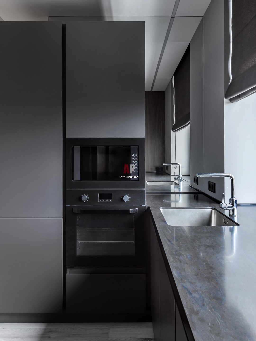 Минималистская кухня с закрытыми фасадами выполнена на заказ в сером цвете.
