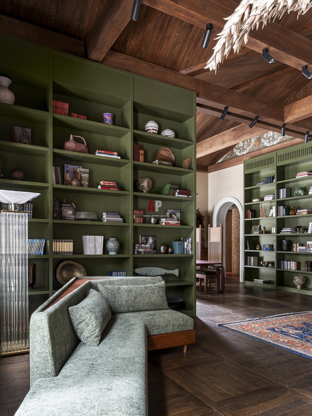 Высоту гостиной подчеркивают высокие стеллажи. Насыщенный еловый цвет взят как основа палитры, он перекликается с природным окружением и помогает растворить интерьер в лесном ландшафте