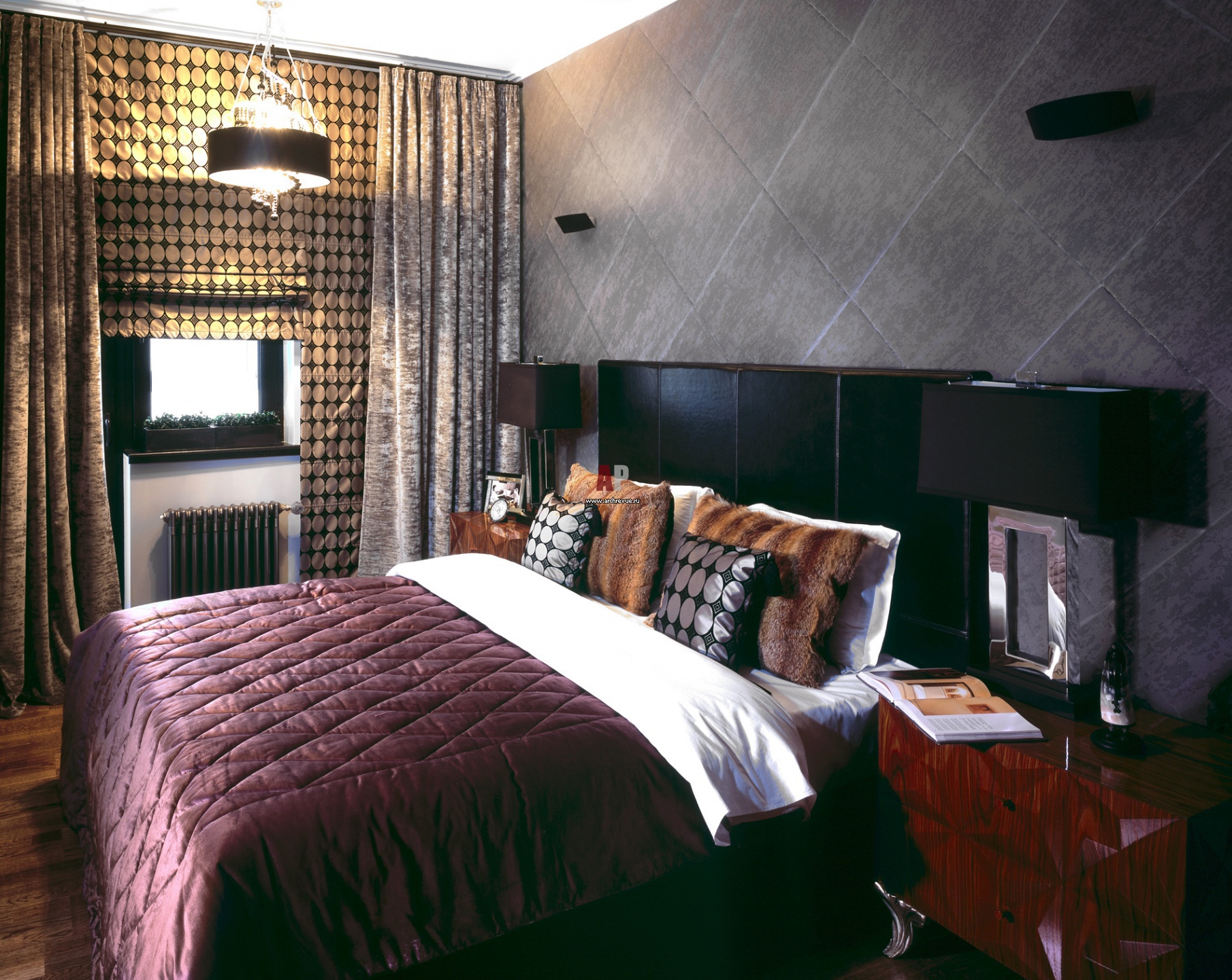Затянутая бархатом стена у изголовья кровати – не только дань общей стилистике интерьера, но и вполне функциональный элемент. Задача тканевых панелей – гасить звуки, поскольку прямо за стеной находится лестничная клетка.