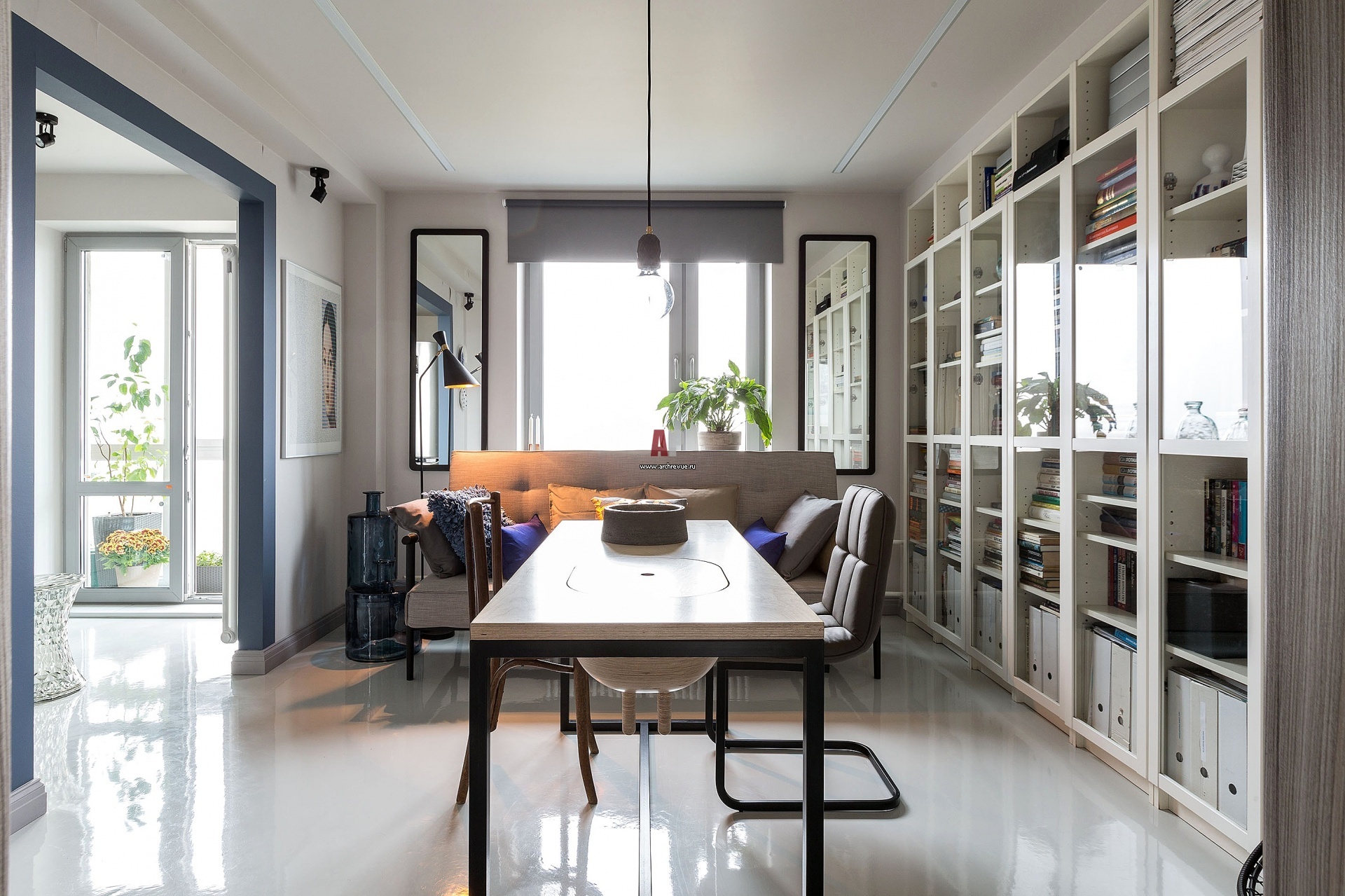 Гостиная также играет роль столовой, места сбора гостей и кабинета. Диван раскладывается, образуя дополнительное спальное место. Стол, на заказ, изготовление «АрхПоле». Светильник над столом, Latitude.