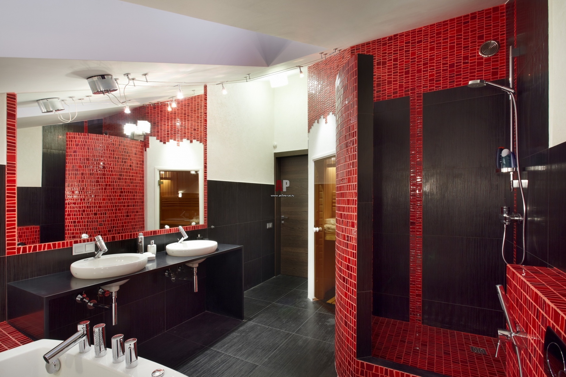 Интерьер ванной комнаты в контрастной красно-черной цветовой гамме.