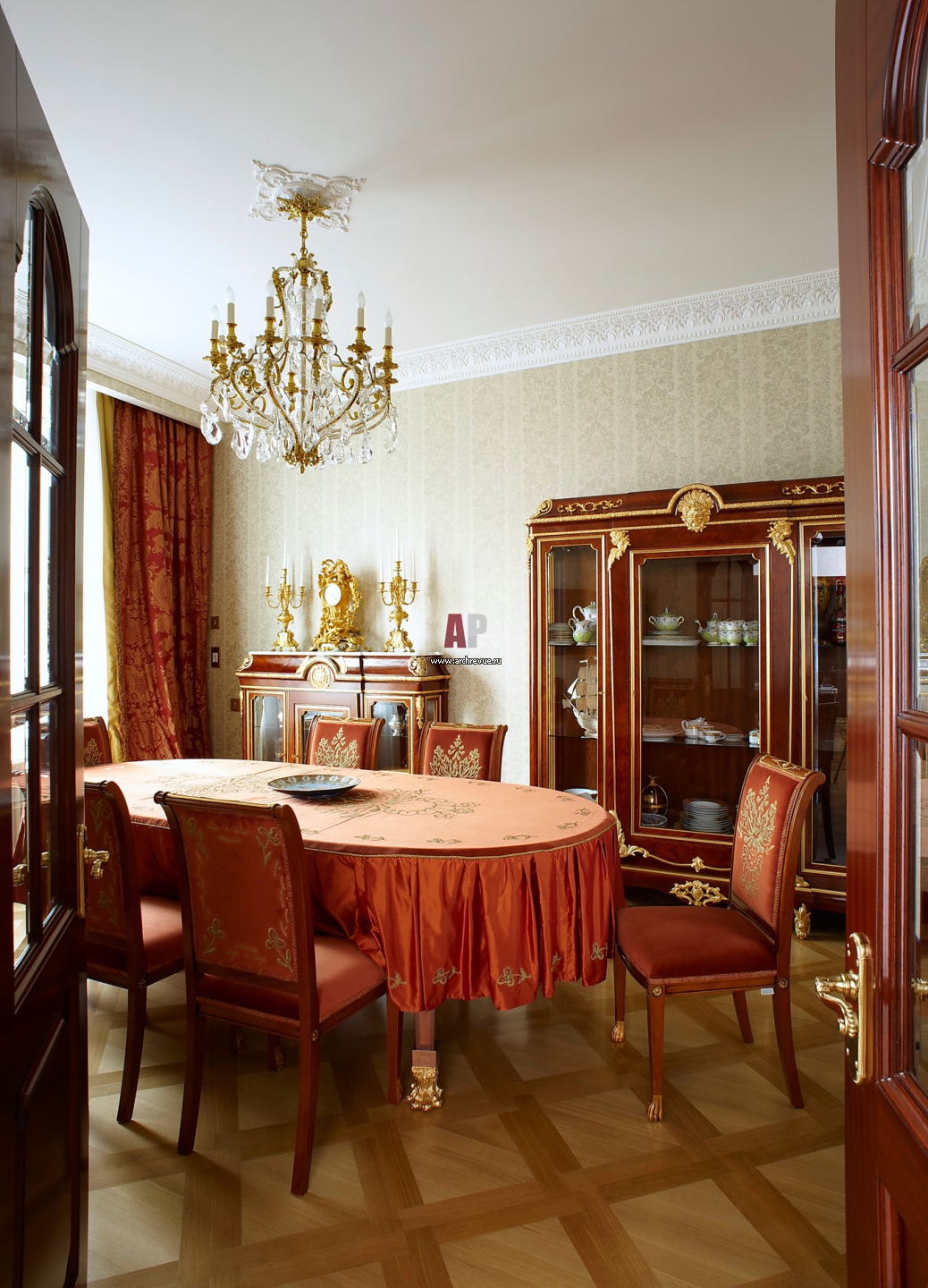 Парадная столовая занимает отдельное помещение. Бархатная скатерть, как и обивка для стульев, сделана из ткани Daniela Lucato с ручной вышивкой по эскизам авторов проекта.