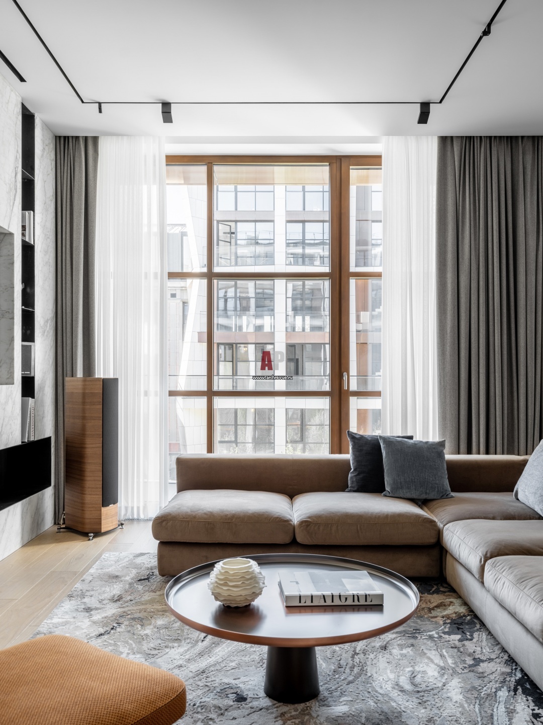 Цветовая палитра крайне нейтральная, это фон для картин и предметов мебели. Она должна всего лишь подчеркнуть графику плоскостей, не спорить с солнечными бликами по утрам, быть комфортной в любом освещении, держать внимание на предметах искусства. Диван, DiTre Italia.
