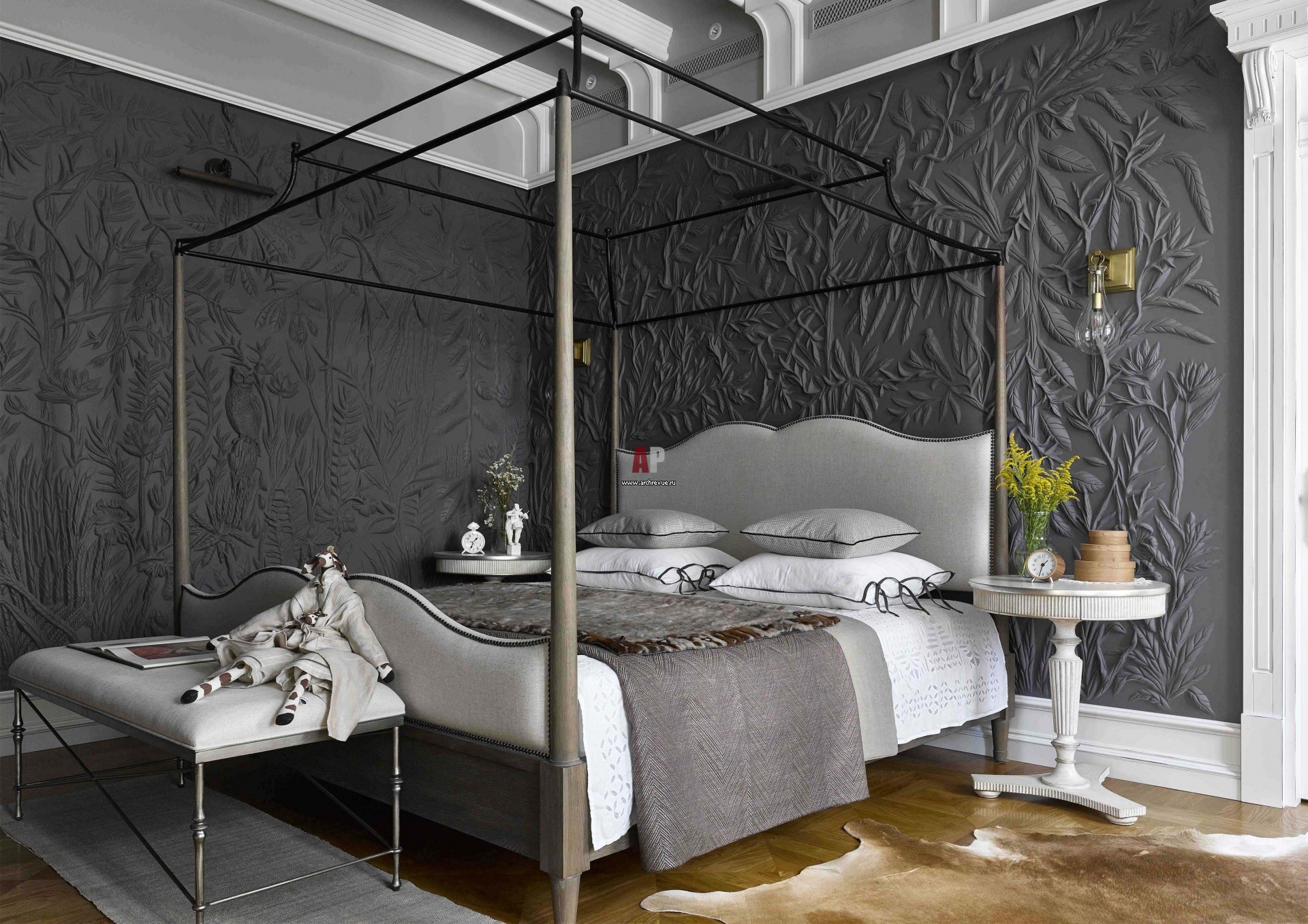 Стены спальни оформлены барельефом с растительным декором по мотивам работ Анри Руссо. На создание барельефа ушло четыре месяца, каждая его деталь вылеплена вручную и сверху окрашены в сложный фиолетовый цвет. Кровать, банкетка, Bernhardt. Прикроватный столик, Vittorio Grifoni.