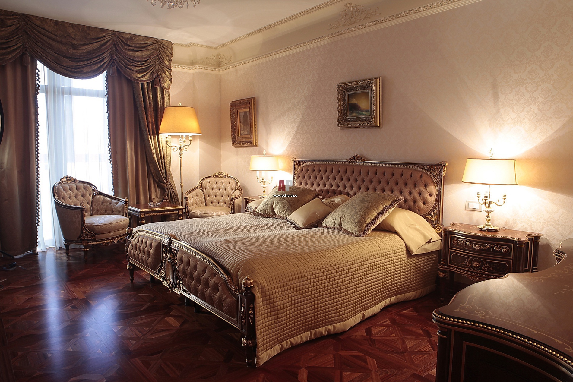 Спальня выдержана в золотистых оттенках и меблирована предметами марки Meroni Francesco, семейной мануфактуры, на которой все делают вручную. На окнах - гардины с широким ламбрекеном, такое оформление не дробит пространство, выделяет окно и делает его значимым элементом интерьера.