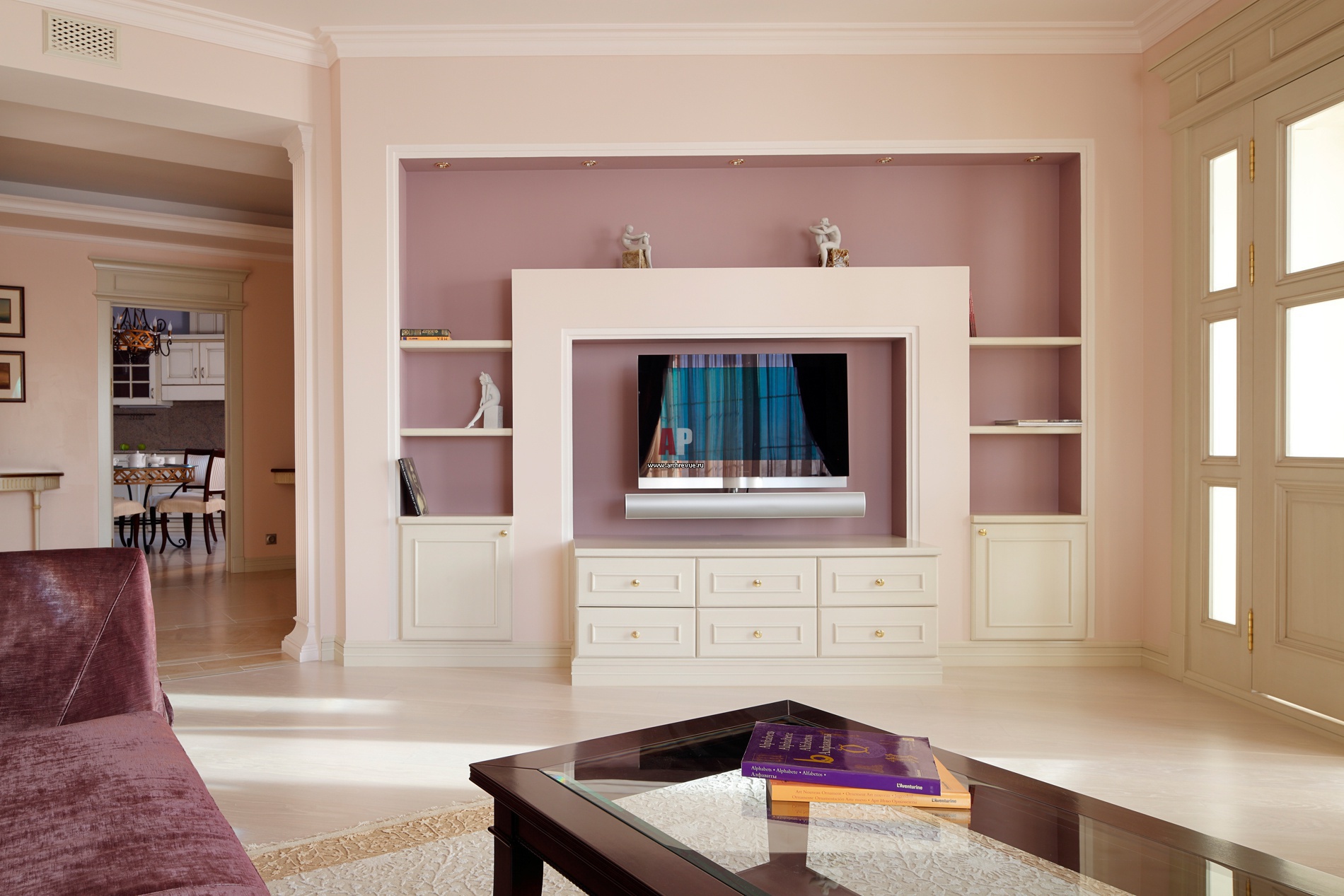 Характерная особенность этого интерьера – цветовое решение: молочные оттенки в оформлении полов, стен, лепного декора и мебели. Автор проектирует корпусную мебель в гостиную в комплекте с нестандартными дверями, ведущими в кабинет.