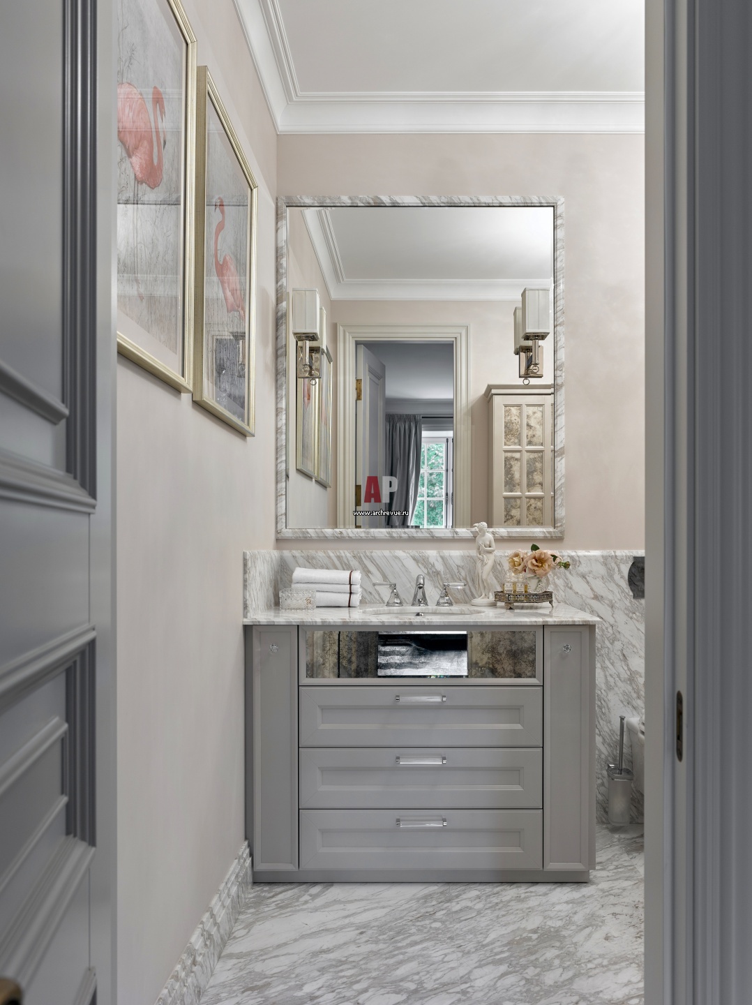 Ванная комната. Полы, низ стен и рама зеркала – мрамор, Volokas. Мебель сделана на заказ в столярной мастерской по эскизам дизайнера. Бра, Visual Comfort & Co.