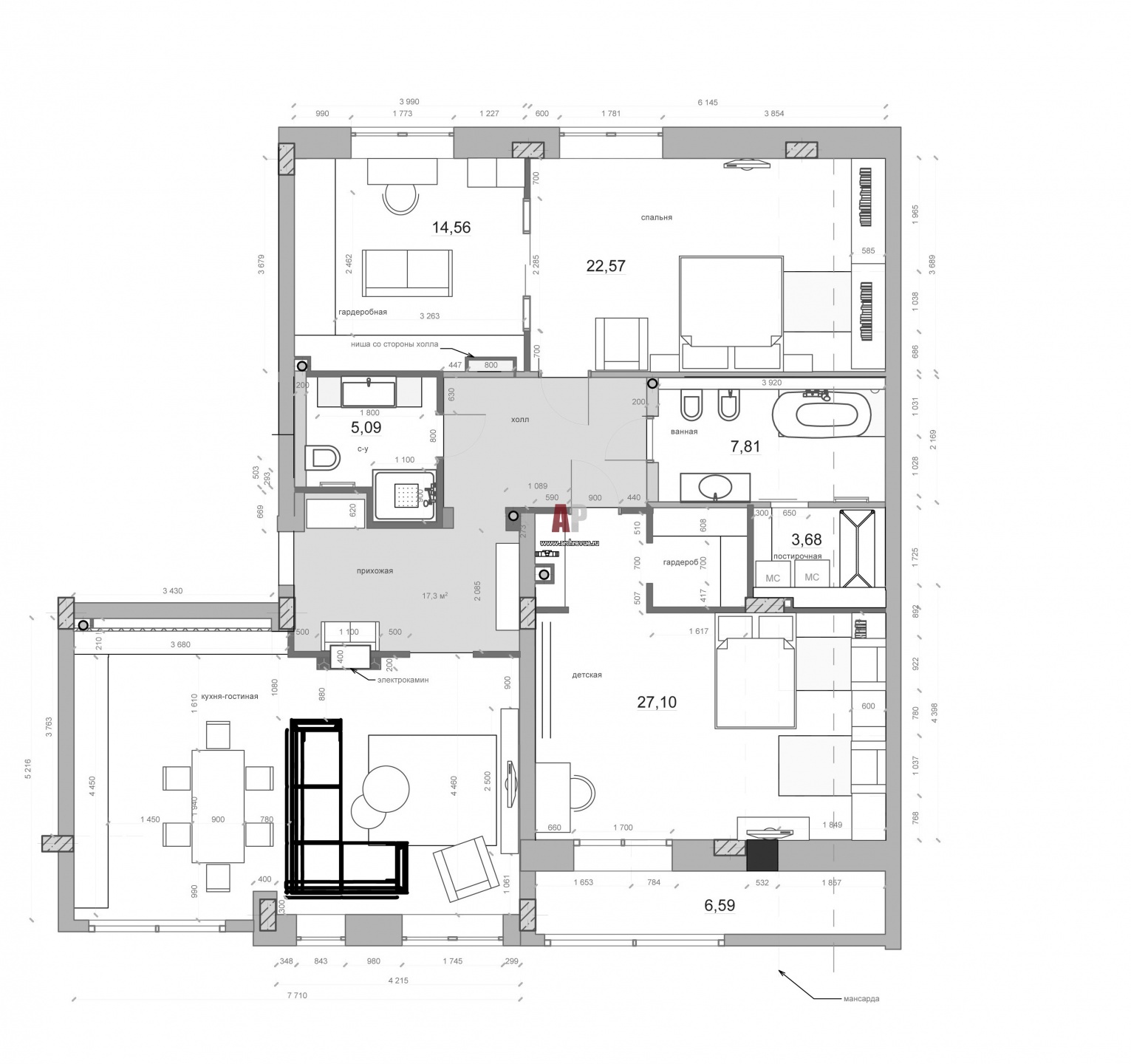 План объединенных одно и трехкомнатной квартир. Общая площадь – 123 кв. м.