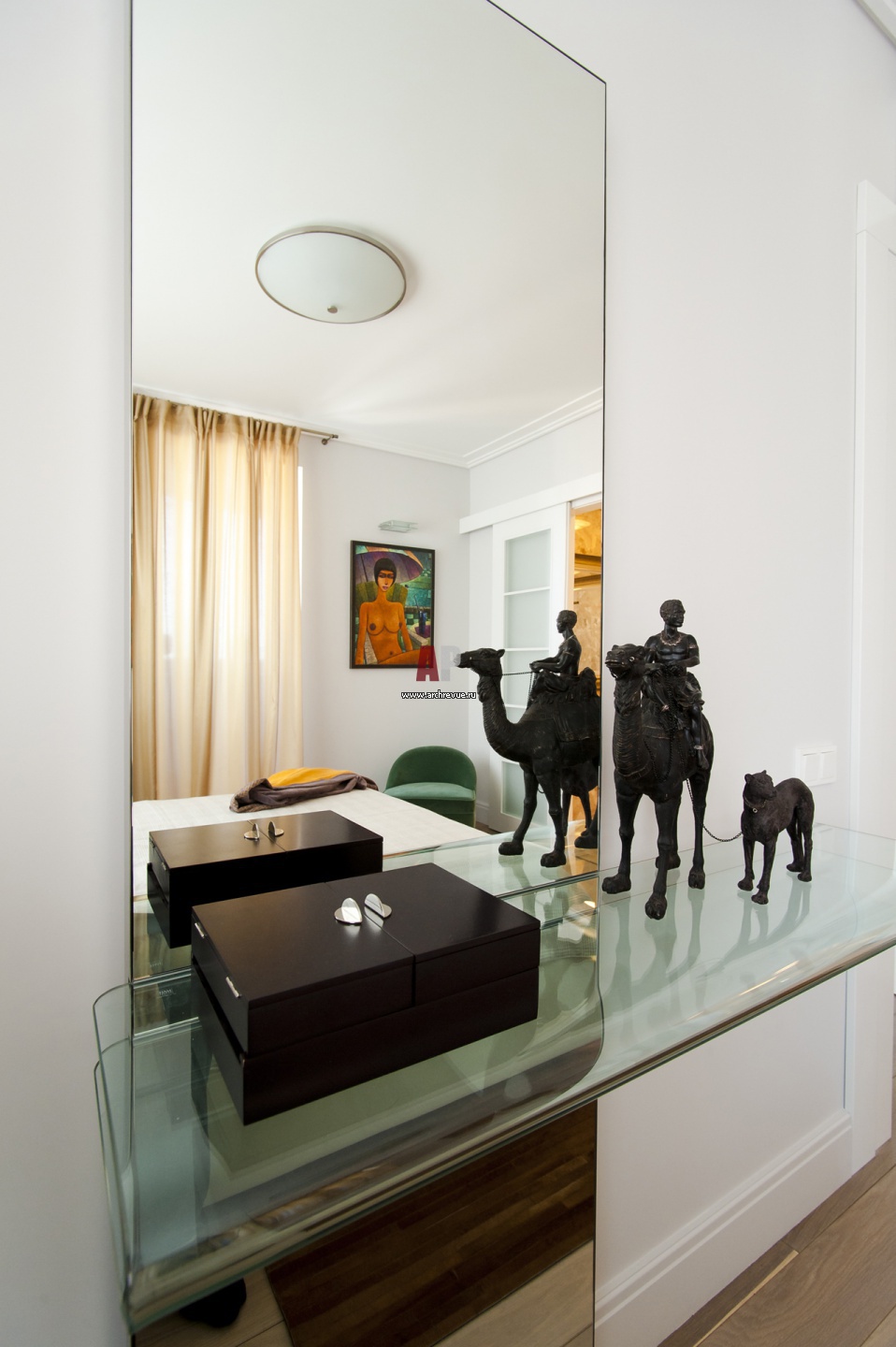 Туалетный столик в спальне сделан из стекла. В зеркале отражается одна из двух работ грузинского художника Мираба Джмухидзе.