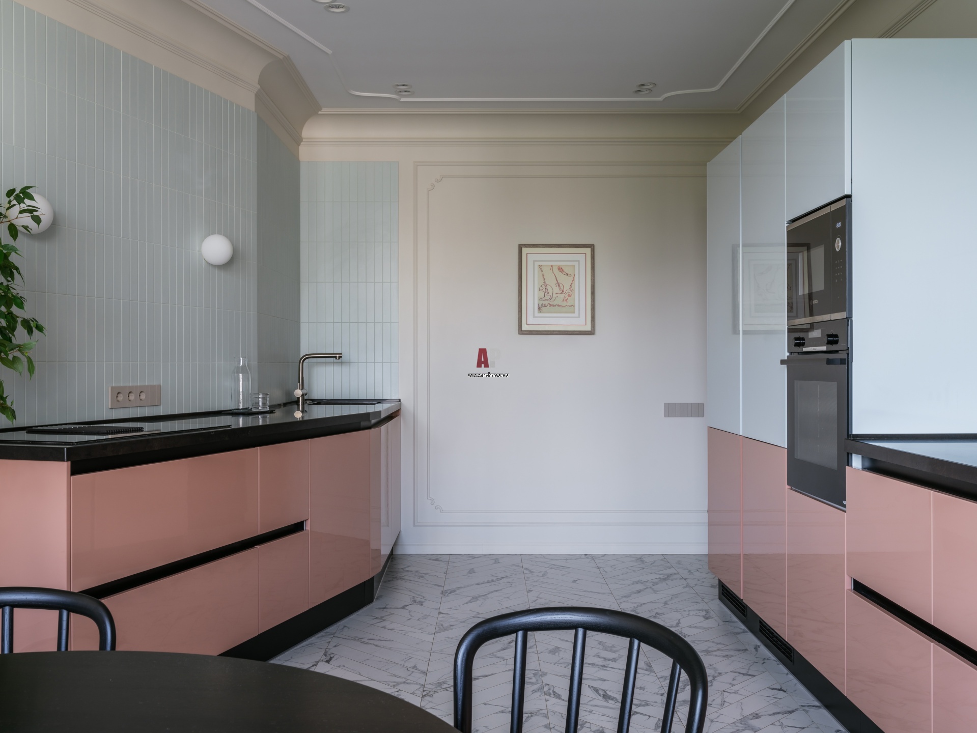 Сложную форму помещения кухни со скошенным углом повторяет параллельный кухонный гарнитур. Фасады выполнены в двух цветах и окрашены в пастельные оттенки: коралловый и ментоловый. В цвет к ним подобрана керамическая плитка на фартуке, который дизайнеры продолжили до потолка. На стене литография Макса Эрнста «Спиральное».
