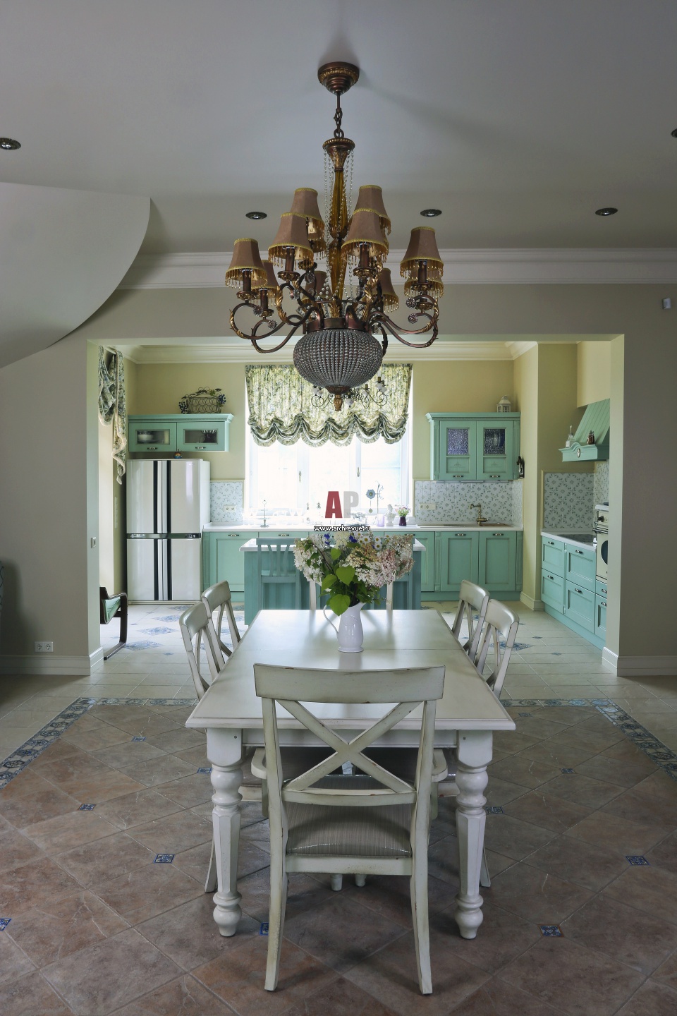 Интерьер кухни исполнен в стиле Прованс. Полы выложены терракотовой плиткой, кухонный гарнитур бирюзового цвета с патиной.