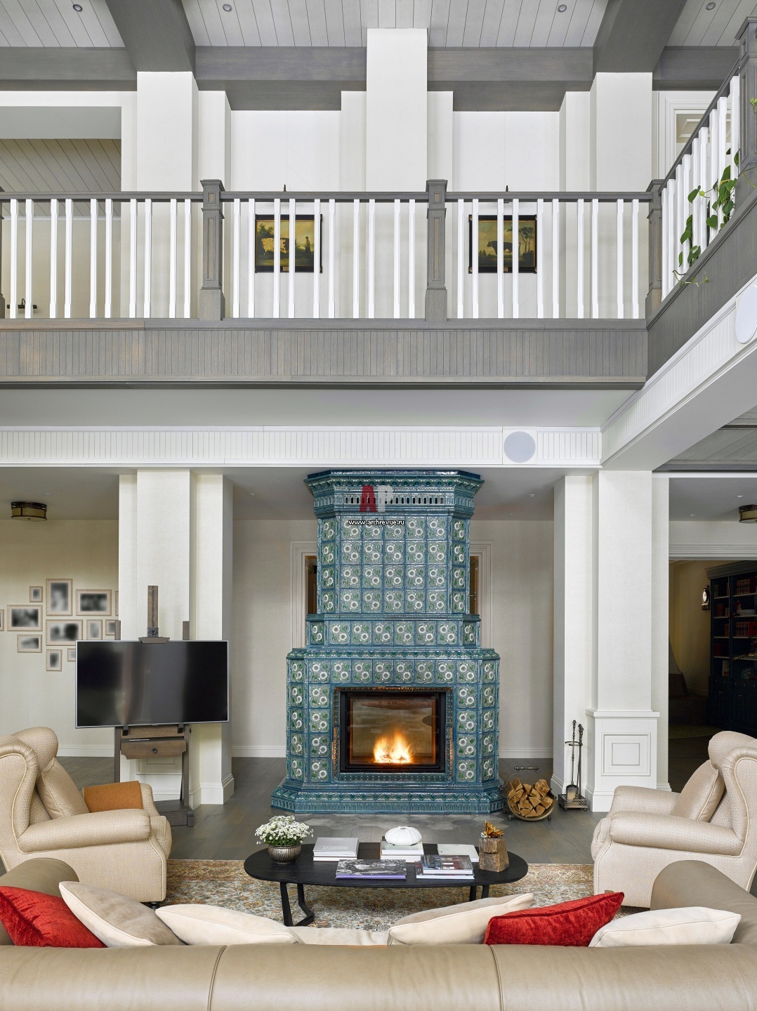 Главный акцент общей гостиной – двусторонняя печь-камин, она отделана изразцами с изображением ромашек, вдохновением для которых стала историческая европейская керамика. Прозрачная топка позволяет видеть пламя в коридоре и в зимнем саду, расположенном напротив. Телевизор закреплен на мольберте.