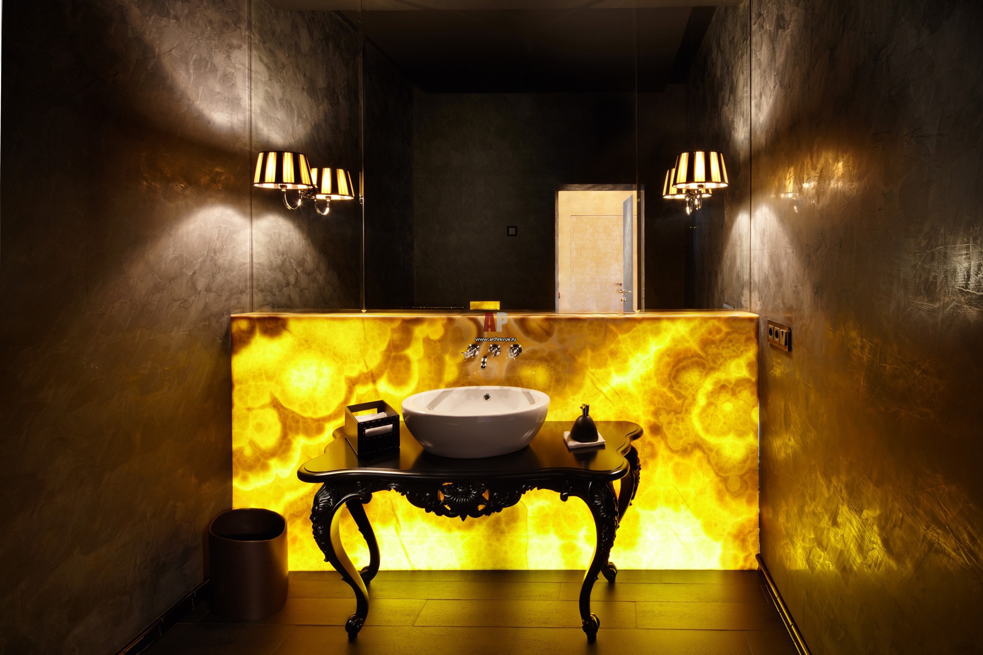 Украшение интерьера гостевого санузла – стена из подсвеченного оникса. Она дает рассеянный свет на черные стены и лакированную резную консоль, выполненную на заказ российским мастером.