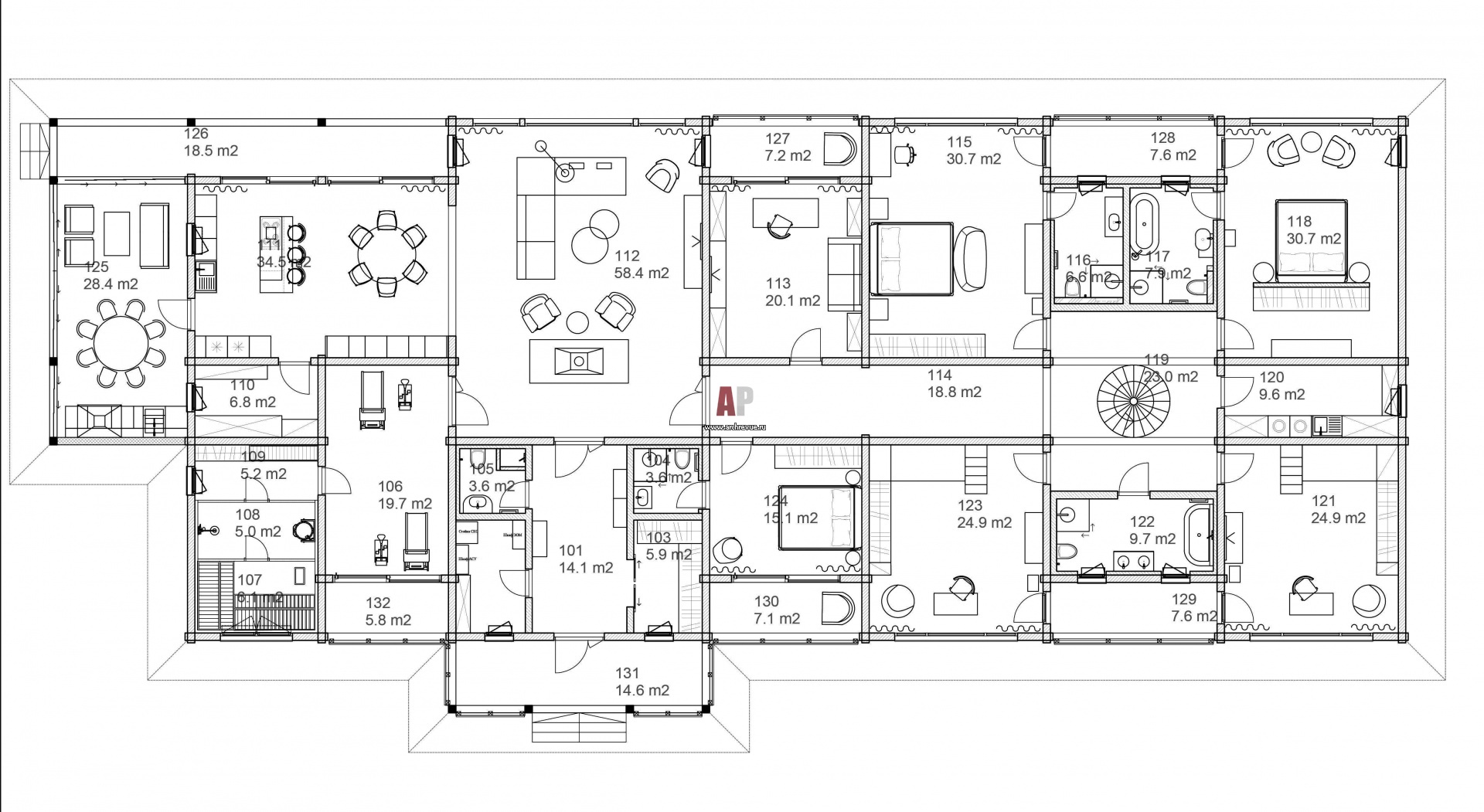 Планировка 1-этажного дома из клееного бруса. Общая площадь – 550 кв. м.