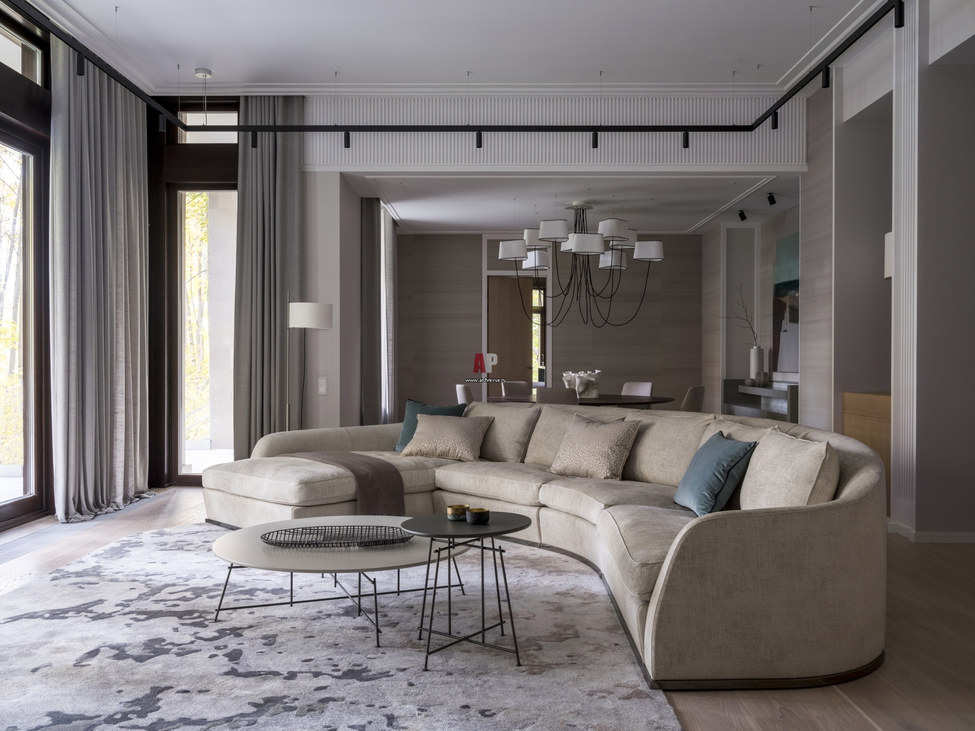 Мягкая группа в гостиной. Полукруглый диван, Flexform, модель Mood. Столики, Lema.
