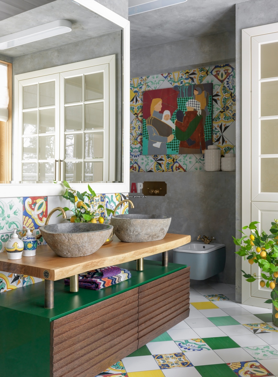 Интерьер ванной комнаты в этническом стиле. Деревянная тумба умывальника сделана на заказ, раковины выполнены из цельного куска камня.