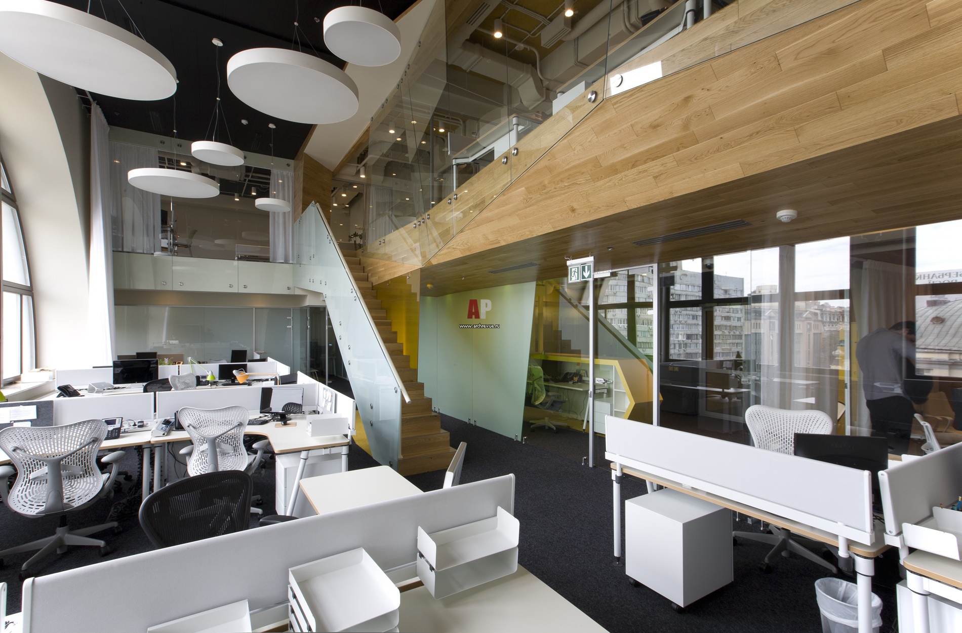 Рабочая зона первого этажа организована по принципу open-space. Авторы проекта Петр Зайцев, Арсений Борисенко, архитектурное бюро za bor. Круглые светильники, Xal. Проектом предполагалась исключительно сложная геометрия галереи и лестницы, с которой они решены как одно целое.