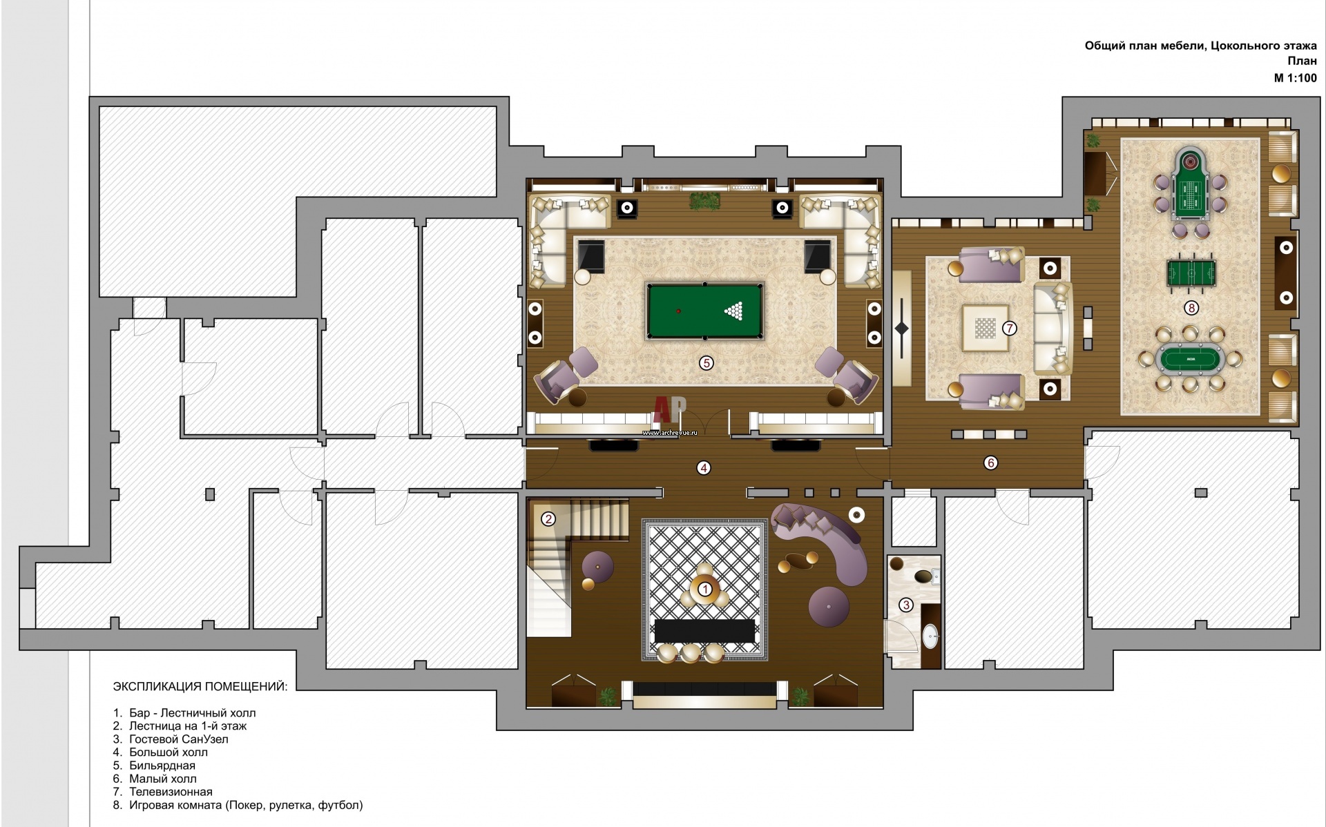 Планировка цокольного этажа 4-х этажной семейной резиденции. Общая площадь – 2000 кв. м.