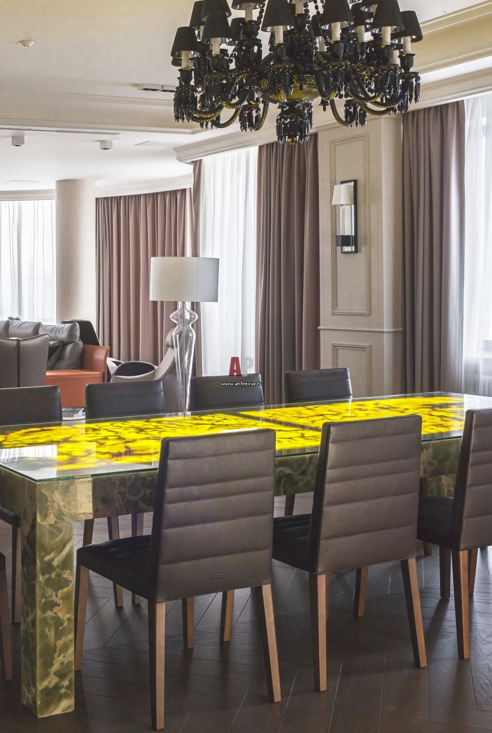 Обеденный стол из зеленого оникса размером 3Х 1,2 м со встроенной светодиодной подсветкой весит больше 500 кг. Ножки стола также каменные, столешница сверху защищена стеклом толщиной 8 мм.