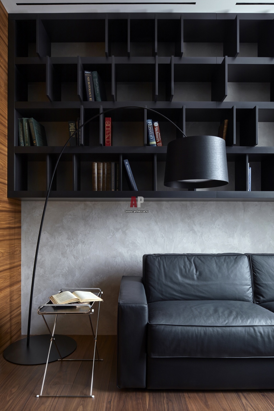 Кабинет исполнен в темных тонах. Стены частично зашиты панелями из американского ореха, частично выкрашены в асфальтовый цвет. Раскладной кожаный диван Milano Bedding, модель Prince. Торшер, Foscarini.