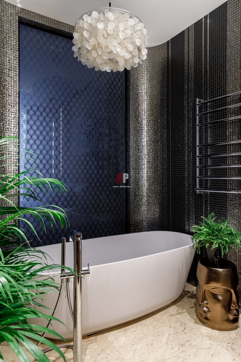 Заказчики изначально хотели отдельно стоящую ванну Antonio Lupi. Ее дизайнер разместила напротив стеклянной перегородки. Стены облицованы мозаикой, имитирующей водопад. Люстра с пластинами из перламутра, Verpan.