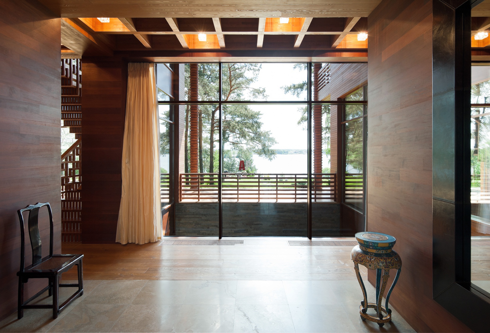 Входная зона в современном стиле. Из панорамных окон открывается вид на водоем.