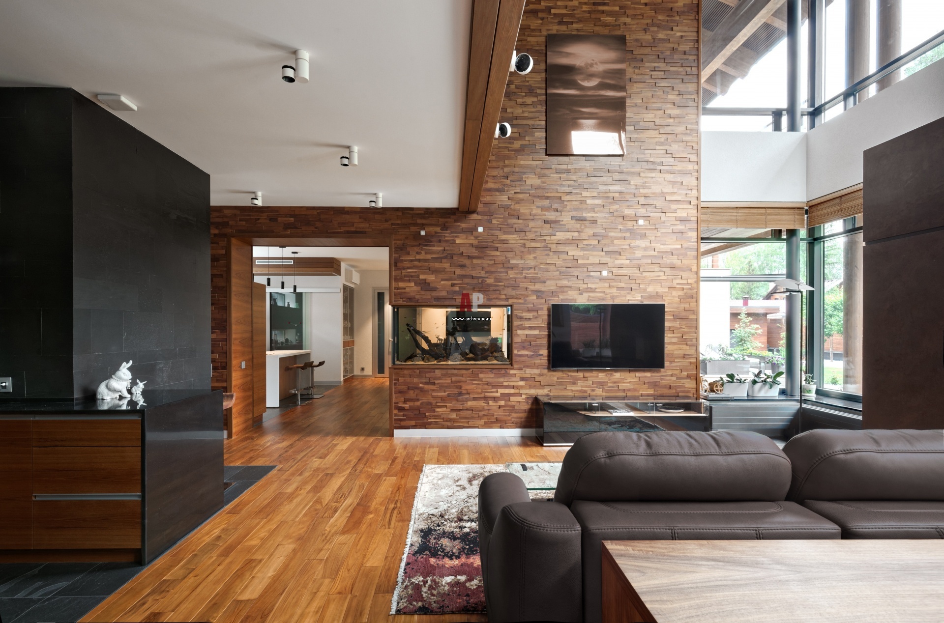 Модернистский дом с природными мотивами. Интерьер гостиной. Перегородка с ТВ облицована мозаикой из тика Porcelanosa (линия Dune). Фотопанно работы американского фотохудожника Питера Лика.