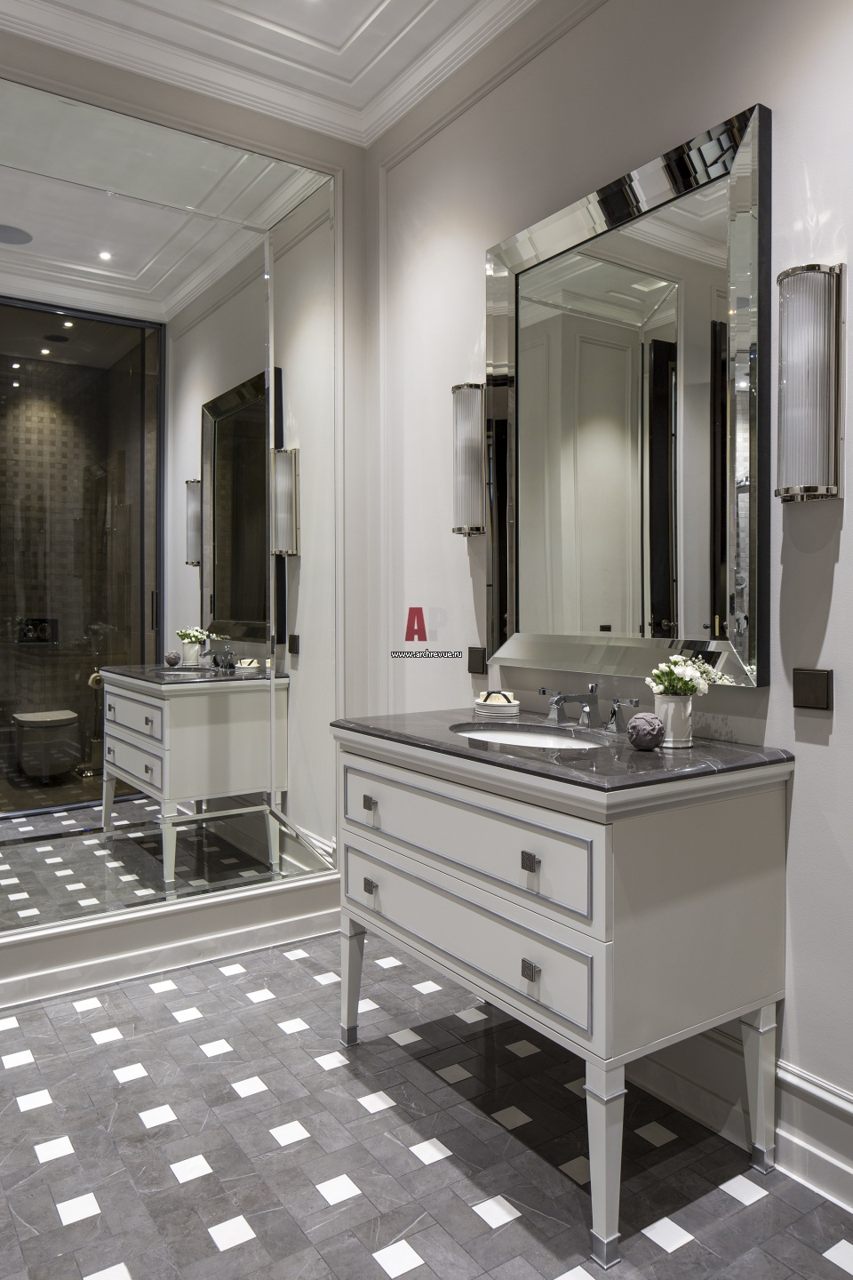 Хозяйская ванная комната в стиле ар-деко. Умывальник сделан на заказ по эскизам автора проекта. Сантехника, Devon & Devon. Смесители, Kohler.