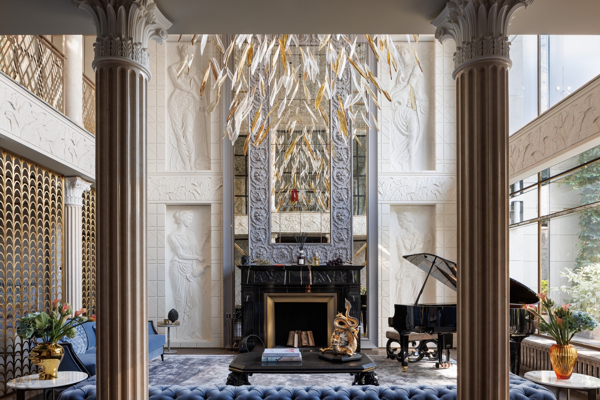 Двухсветная гостиная. В центре композиции – камин, отделанный мрамором Sahara Noir. С боков его акцентирует авторский барельеф «Времена года» работы Светланы Серебряковой, ученицы скульптора М. К. Аникушина. Барельеф символизирует четыре времени года и служит современной интерпретацией античного сюжета «Фонтана нимф» Жана Гужона в Париже.