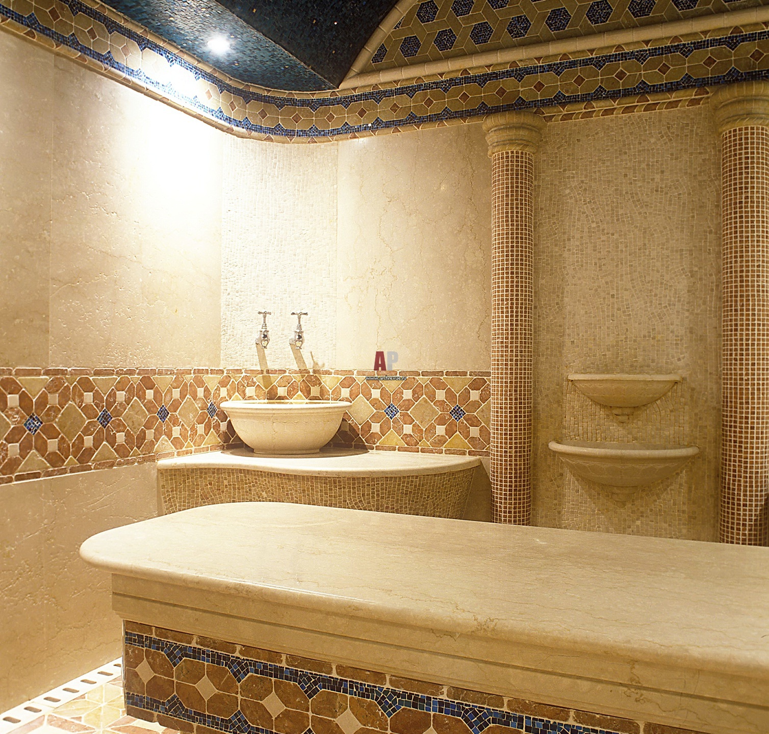 Хаммам работает за счет нагрева изнутри горячей водой. Для этого за камнем были проложены медные трубы и от них нагреваются все горизонтальные и вертикальные поверхности. Помещение облицовано мраморной мозаикой по авторским эскизам, поставщик «Керамос».