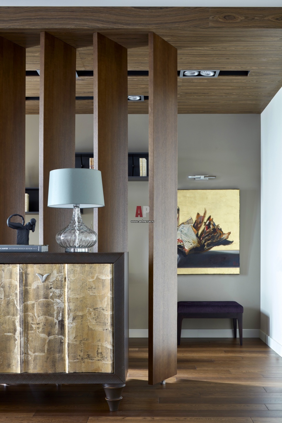 Перегородка в гостиной выполнена по принципу офисной, но оснащена механизмом, который позволяет менять направление всех панелей одновременно. В закрытом состоянии она превращается в глухую стену, в открытом – панели поворачиваются на 45 градусов и дают ощущение воздуха.