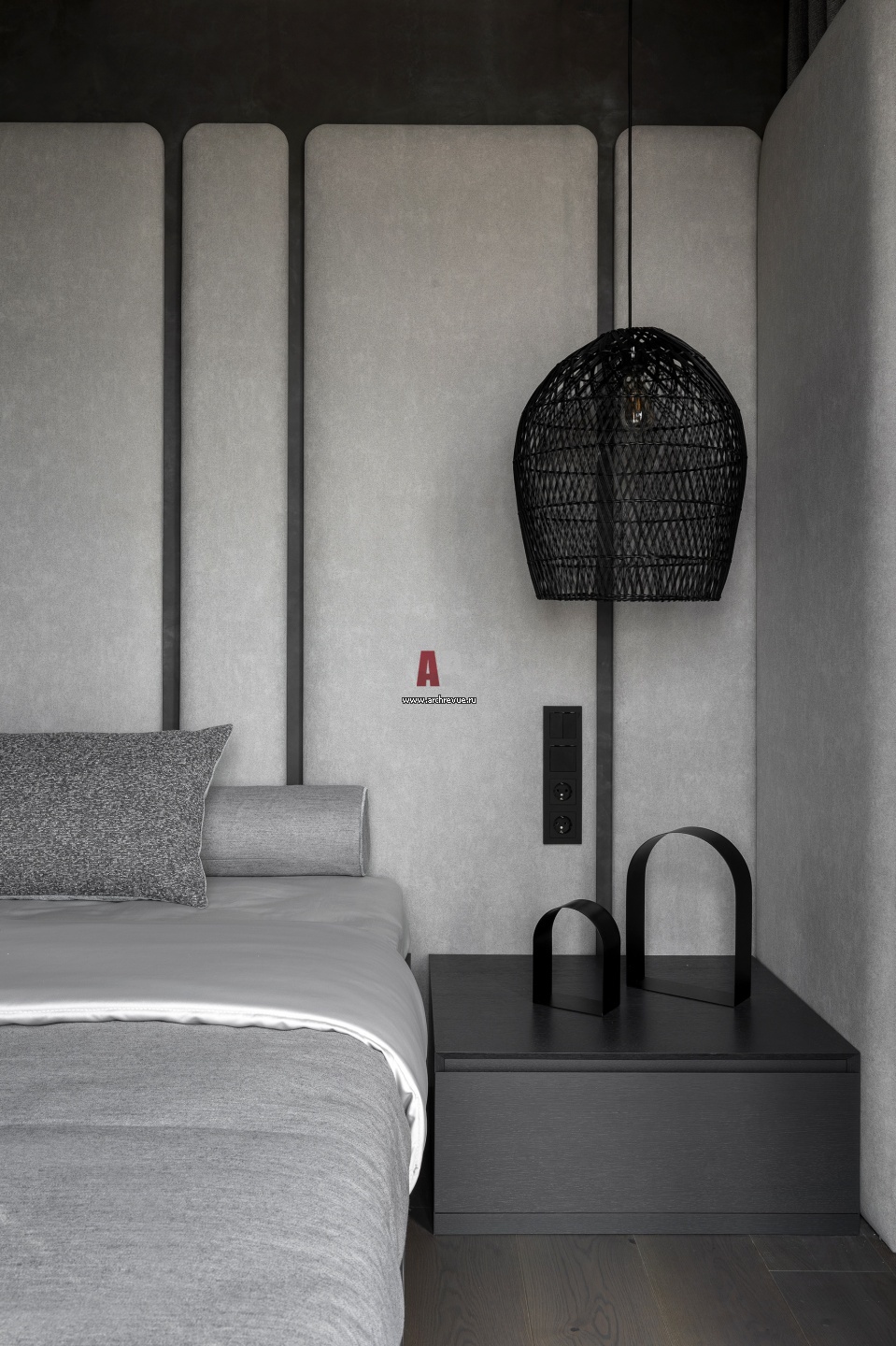 Семейная квартира с монохромной темной палитрой. Интерьер родительской спальни.