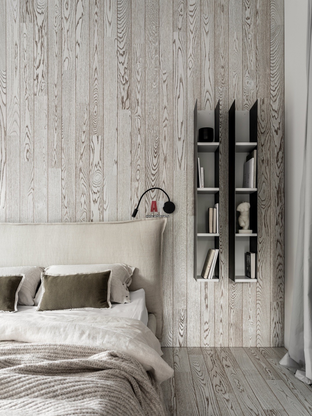 В оформлении спальни использована паркетная с активной графичной текстурой доска, она переходит с пола на стену за изголовьем кровати. Полки из горячекатанной стали и фанеры сделан на заказ. Кровать, Alf DaFre.